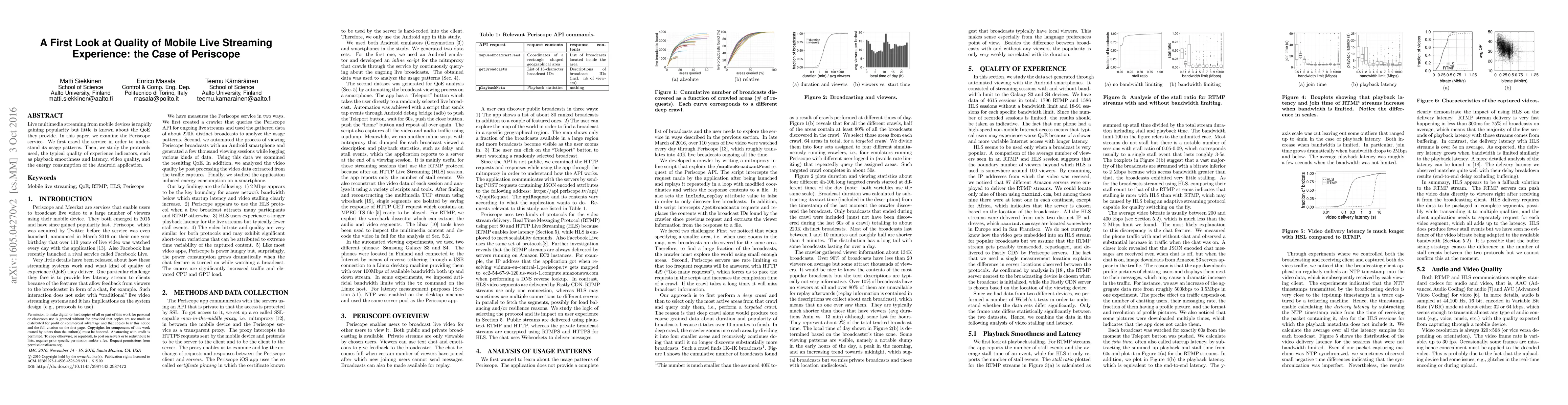 This paper investigates the quality of Periscope's mobile live streaming service. It crawls Periscope data to understand usage patterns, examines protocols, and assesses quality indicators like playback smoothness, latency, video quality, and energy consumption on Android devices.