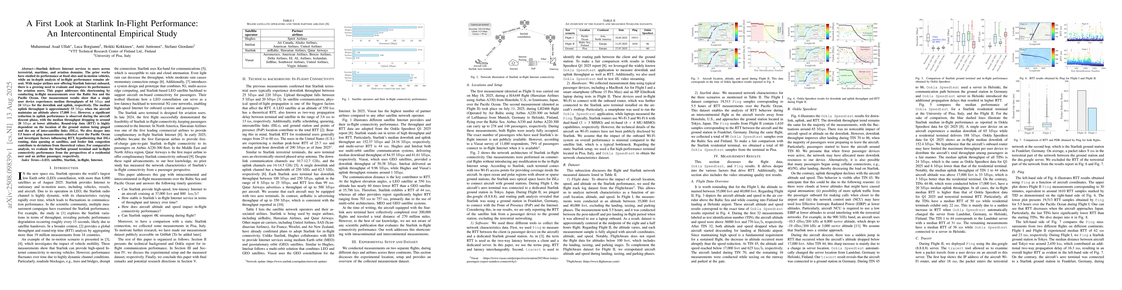 Starlink delivers Internet services to users across terrestrial, maritime, and aviation domains. The prior works have studied its performance at fixed sites and in-motion vehicles, while an in-depth analysis of in-flight performance remains absent. With major airlines now offering Starlink Internet onboard, there is a growing need to evaluate and improve its performance for aviation users. This paper addresses this shortcoming by conducting in-flight measurements over the Baltic Sea and the Pacific Ocean. Our measurement results show that a single user device experiences median throughputs of 64 Mbps and 24 Mbps for the downlink and uplink, respectively. The median uplink throughput is approximately 33 Mbps when the aircraft maintains an altitude above 17,000 feet. However, a significant reduction in uplink performance is observed during the aircraft descent phase, with the median throughput dropping to around 20 Mbps at lower altitudes. Round-trip time (RTT) is highly dependent on the location of the ground station being pinged and the use of inter-satellite links (ISLs). We dive deeper into 5.5 hours of ping measurements collected over the Pacific Ocean and investigate factors influencing RTT, hypothesizing that ISLs routing, data queuing at satellites, and feeder link congestion contribute to deviations from theoretical values. For comparative analysis, we evaluate the Starlink ground terminal and in-flight connectivity performance from the perspectives of a residential user and an airline passenger, respectively.