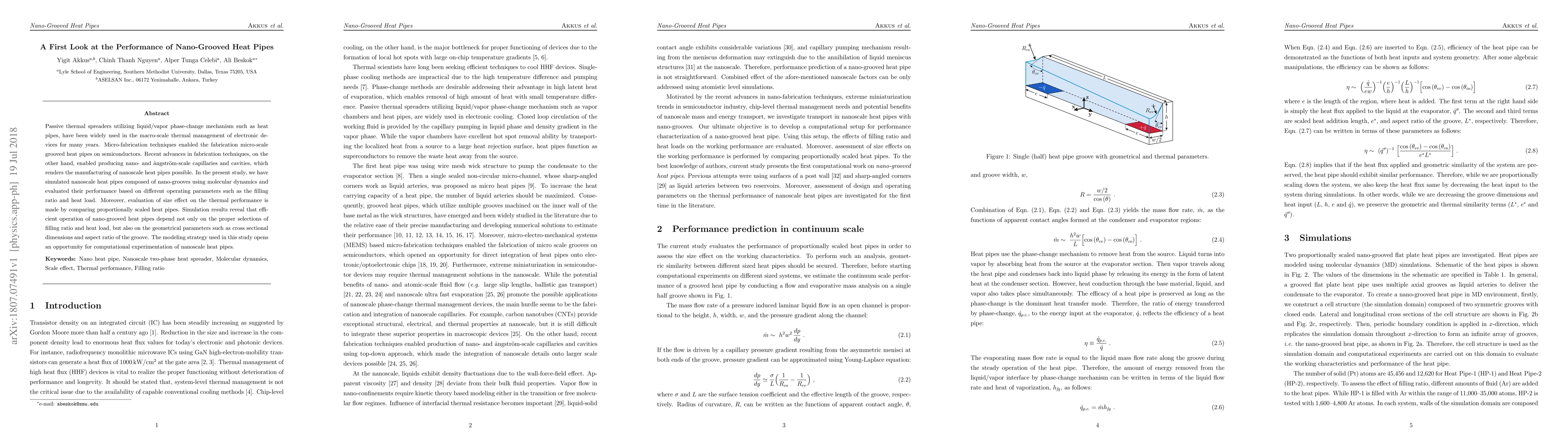 This study simulates nano-grooved heat pipes using molecular dynamics to evaluate their thermal performance under various operating parameters. Results indicate that efficient operation depends on filling ratio, heat load, and geometrical parameters like groove dimensions and aspect ratio.