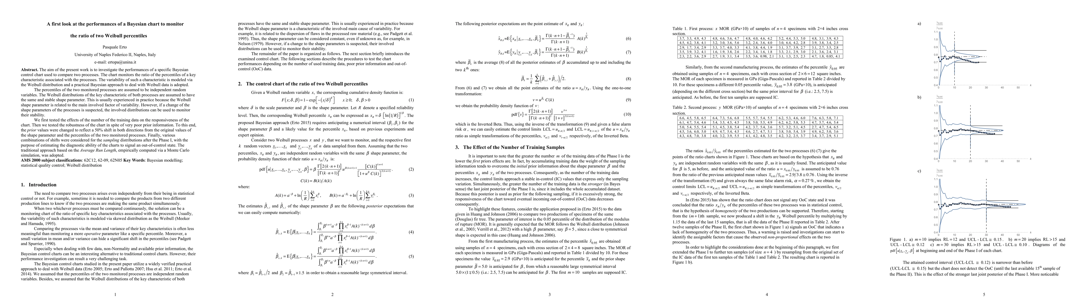 The aim of the present work is to investigate the performances of a specific Bayesian control chart used to compare two processes. The chart monitors the ratio of the percentiles of a key characteristic associated with the processes. The variability of such a characteristic is modeled via the Weibull distribution and a practical Bayesian approach to deal with Weibull data is adopted. The percentiles of the two monitored processes are assumed to be independent random variables. The Weibull distributions of the key characteristic of both processes are assumed to have the same and stable shape parameter. This is usually experienced in practice because the Weibull shape parameter is related to the main involved factor of variability. However, if a change of the shape parameters of the processes is suspected, the involved distributions can be used to monitor their stability. We first tested the effects of the number of the training data on the responsiveness of the chart. Then we tested the robustness of the chart in spite of very poor prior information. To this end, the prior values were changed to reflect a 50% shift in both directions from the original values of the shape parameter and the percentiles of the two monitored processes. Finally, various combinations of shifts were considered for the sampling distributions after the Phase I, with the purpose of estimating the diagnostic ability of the charts to signal an out-of-control state. The traditional approach based on the Average Run Length, empirically computed via a Monte Carlo simulation, was adopted.
