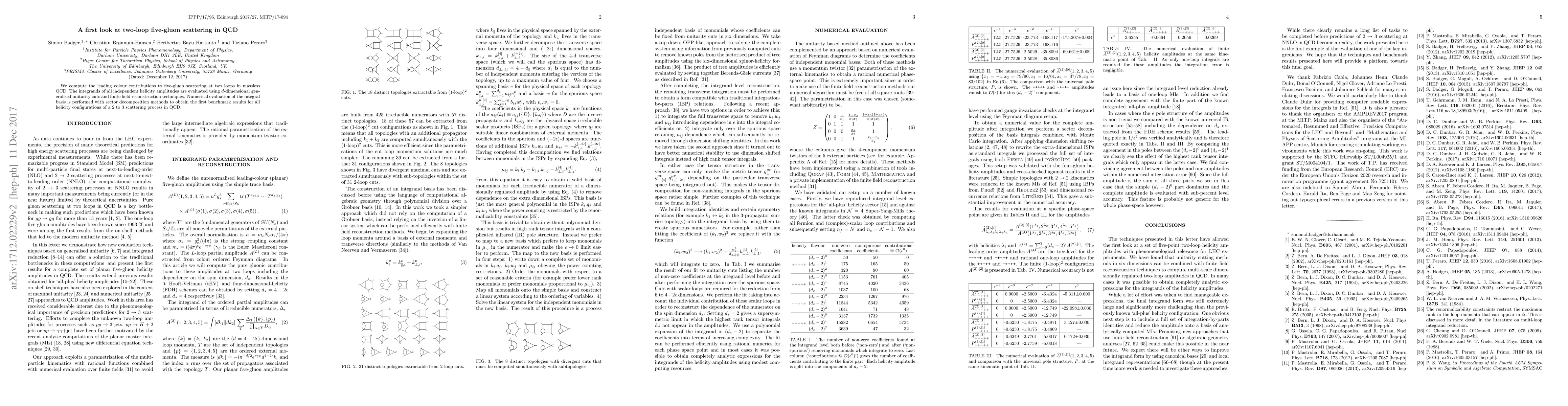 We compute the leading colour contributions to five-gluon scattering at two loops in massless QCD. The integrands of all independent helicity amplitudes are evaluated using d-dimensional generalised unitarity cuts and finite field reconstruction techniques. Numerical evaluation of the integral basis is performed with sector decomposition methods to obtain the first benchmark results for all helicity configurations of a 2 to 3 scattering process in QCD.