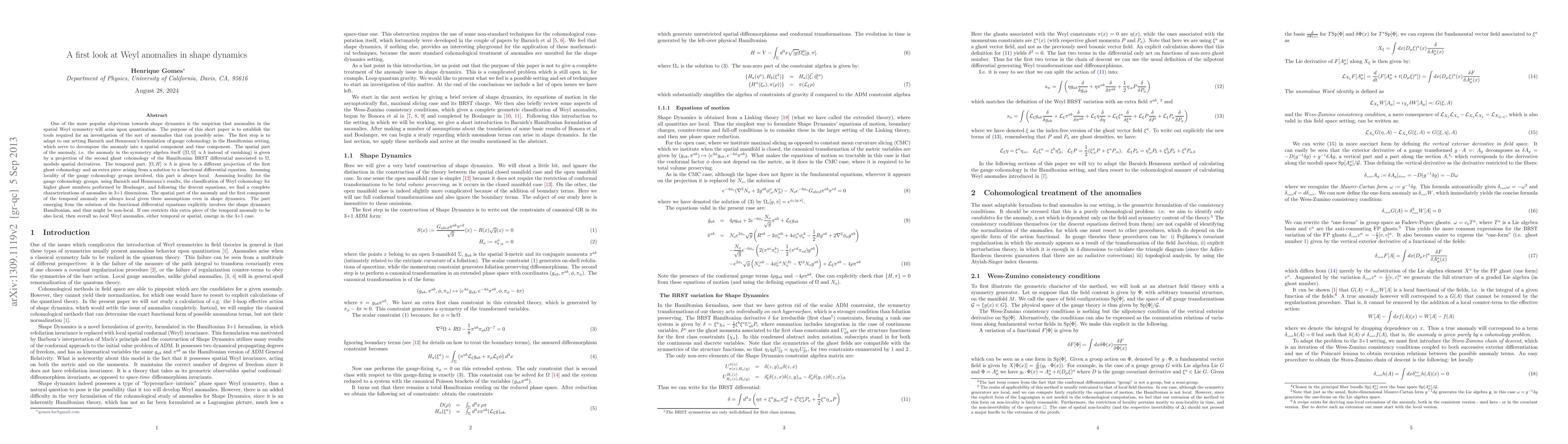 The paper establishes a framework for analyzing Weyl anomalies in Shape Dynamics using cohomological methods, demonstrating that spatial anomalies do not depend on metric momenta and providing a decomposition of symmetry into diffeomorphism and Weyl parts.