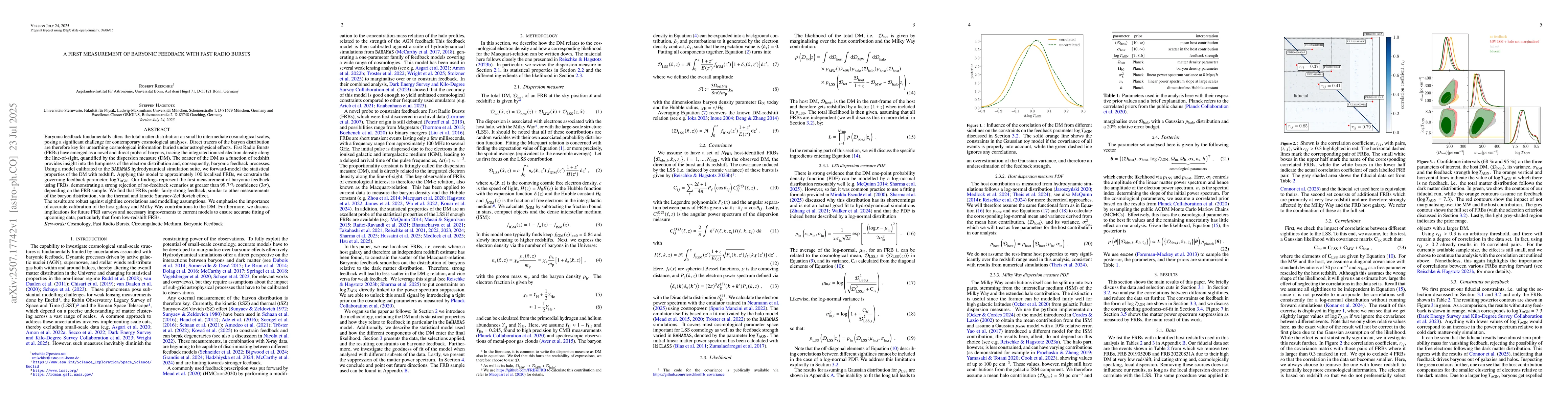Baryonic feedback fundamentally alters the total matter distribution on small to intermediate cosmological scales, posing a significant challenge for contemporary cosmological analyses. Direct tracers of the baryon distribution are therefore key for unearthing cosmological information buried under astrophysical effects. Fast Radio Bursts (FRBs) have emerged as a novel and direct probe of baryons, tracing the integrated ionised electron density along the line-of-sight, quantified by the dispersion measure (DM). The scatter of the DM as a function of redshift provides insight into the lumpiness of the electron distribution and, consequently, baryonic feedback processes. Using a model calibrated to the \texttt{BAHAMAS} hydrodynamical simulation suite, we forward-model the statistical properties of the DM with redshift. Applying this model to approximately 100 localised FRBs, we constrain the governing feedback parameter, $\log T_\mathrm{AGN}$. Our findings represent the first measurement of baryonic feedback using FRBs, demonstrating a strong rejection of no-feedback scenarios at greater than $99.7\,\%$ confidence ($3\sigma$), depending on the FRB sample. We find that FRBs prefer fairly strong feedback, similar to other measurements of the baryon distribution, via the thermal and kinetic Sunyaev-Zel'dovich effect. The results are robust against sightline correlations and modelling assumptions. We emphasise the importance of accurate calibration of the host galaxy and Milky Way contributions to the DM. Furthermore, we discuss implications for future FRB surveys and necessary improvements to current models to ensure accurate fitting of upcoming data, particularly that from low-redshift FRBs.