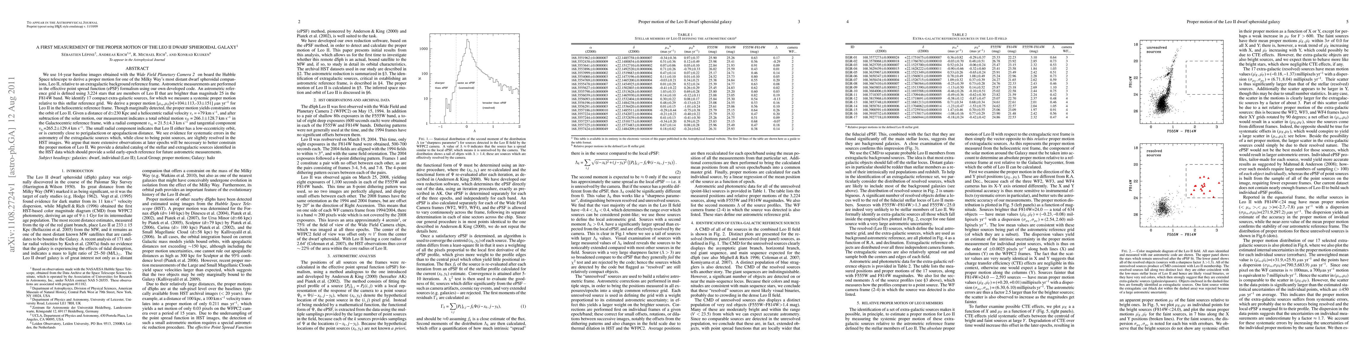 We use 14-year baseline images obtained with the Wide Field Planetary Camera 2 on board the Hubble Space telescope to derive a proper motion for one of the Milky Way's most distant dwarf spheroidal companions, Leo II, relative to an extragalactic background reference frame. Astrometric measurements are performed in the effective point spread function (ePSF) formalism using our own developed code. An astrometric reference grid is defined using 3,224 stars that are members of Leo II that are brighter than magnitude 25 in the F814W band. We identify 17 compact extra-galactic sources, for which we measure a systemic proper motion relative to this stellar reference grid. We derive a proper motion [\mu_{\alpha},\mu_{\delta}]=[+104+/-113,-33+/-151] microarcseconds/yr for Leo II in the heliocentric reference frame. Though marginally detected, the proper motion yields constraints on the orbit of Leo II. Given a distance of 230 Kpc and a heliocentric radial velocity +79 km/s, and after subtraction of the solar motion, our measurement indicates a total orbital motion 266.1+/-128.7 km/s in the Galactocentric reference frame, with a radial component +21.5+/-4.3 km/s and tangential component 265.2+/-129.4 km/s. The small radial component indicates that Leo II either has a low-eccentricity orbit, or is currently close to perigalacticon or apogalacticon distance. We see evidence for systematic errors in the astrometry of the extragalactic sources which, while close to being point sources, are slightly resolved in the HST images. We argue that more extensive observations at later epochs will be necessary to better constrain the proper motion of Leo II. We provide a detailed catalog of the stellar and extragalactic sources identified in the HST data which should provide a solid early-epoch reference for future astrometric measurements.