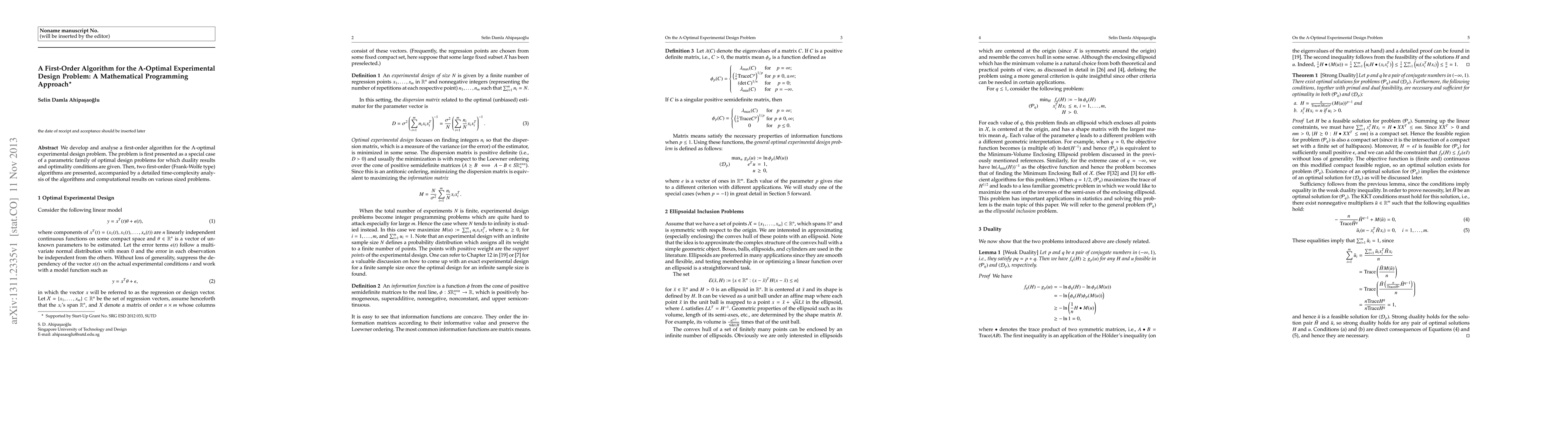 This paper introduces a first-order algorithm for solving the A-optimal experimental design problem, presenting it within a broader mathematical programming framework and analyzing its computational efficiency through detailed time-complexity analysis and practical results.