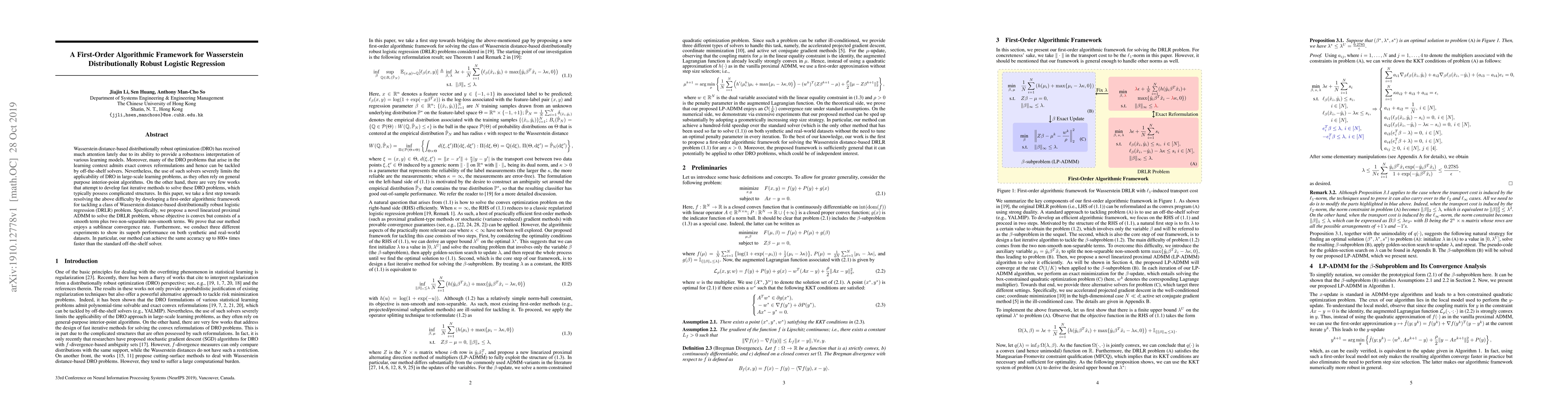This paper introduces a first-order algorithmic framework using a linearized proximal ADMM to efficiently solve Wasserstein distance-based distributionally robust logistic regression (DRLR) problems. The proposed method achieves sublinear convergence and outperforms standard solvers by up to 800+ times in terms of speed while maintaining accuracy.