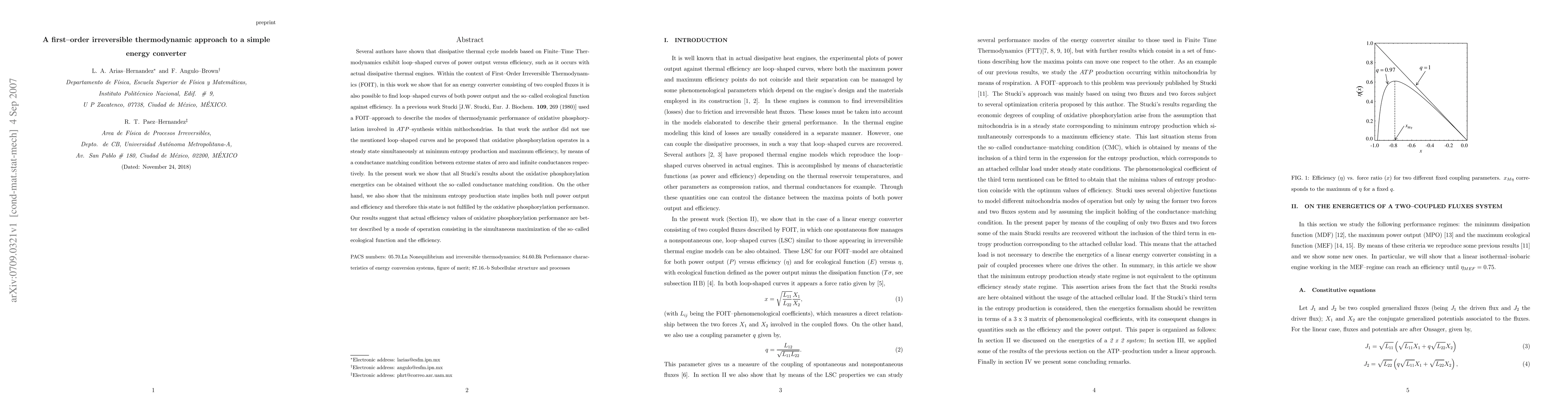 Several authors have shown that dissipative thermal cycle models based on Finite-Time Thermodynamics exhibit loop-shaped curves of power output versus efficiency, such as it occurs with actual dissipative thermal engines. Within the context of First-Order Irreversible Thermodynamics (FOIT), in this work we show that for an energy converter consisting of two coupled fluxes it is also possible to find loop-shaped curves of both power output and the so-called ecological function against efficiency. In a previous work Stucki [J.W. Stucki, Eur. J. Biochem. vol. 109, 269 (1980)] used a FOIT-approach to describe the modes of thermodynamic performance of oxidative phosphorylation involved in ATP-synthesis within mithochondrias. In that work the author did not use the mentioned loop-shaped curves and he proposed that oxidative phosphorylation operates in a steady state simultaneously at minimum entropy production and maximum efficiency, by means of a conductance matching condition between extreme states of zero and infinite conductances respectively. In the present work we show that all Stucki's results about the oxidative phosphorylation energetics can be obtained without the so-called conductance matching condition. On the other hand, we also show that the minimum entropy production state implies both null power output and efficiency and therefore this state is not fulfilled by the oxidative phosphorylation performance. Our results suggest that actual efficiency values of oxidative phosphorylation performance are better described by a mode of operation consisting in the simultaneous maximization of the so-called ecological function and the efficiency.