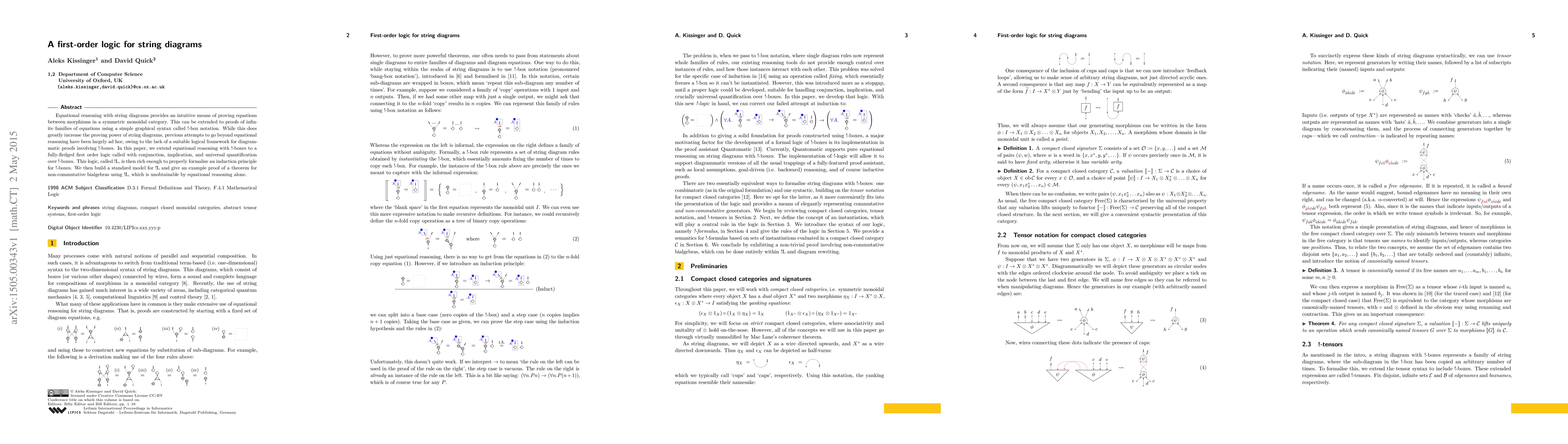 This paper introduces !L, a first-order logic for string diagrams that extends equational reasoning to include conjunction, implication, and universal quantification over !-boxes. It formalizes an induction principle for !-boxes and demonstrates its power with a proof for non-commutative bialgebras.