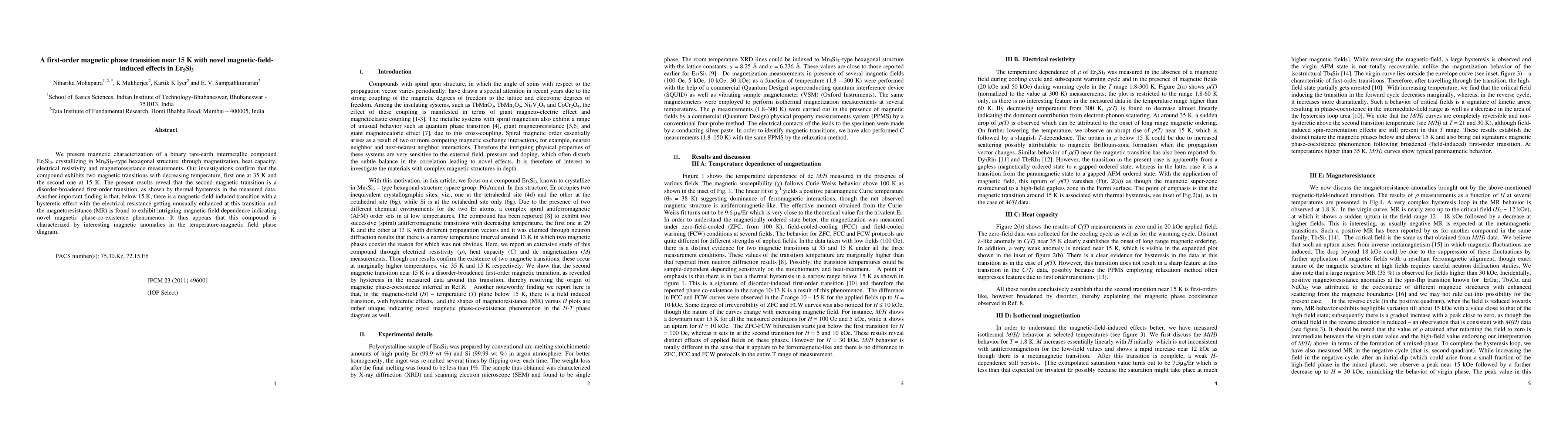 We present magnetic characterization of a binary rare-earth intermetallic compound Er5Si3, crystallizing in Mn5Si3-type hexagonal structure, through magnetization, heat-capacity, electrical resistivity, and magnetoresistance measurements. Our investigations confirm that the compound exhibits two magnetic transitions with decreasing temperature, first one at 35 K and the second one at 15 K. The present results reveal that the second magnetic transition is a disorder-broadened first-order transition, as shown by thermal hysteresis in the measured data. Another important finding is that, below 15 K, there is a magnetic-field-induced transition with a hysteretic effect with the electrical resistance getting unusually enhanced at this transition and the magnetorsistance (MR) is found to exhibit intriguing magnetic-field dependence indicating novel magnetic phase-co-existence phenomenon. It thus appears that this compound is characterized by interesting magnetic anomalies in the temperature-magnetic-field phase diagram.