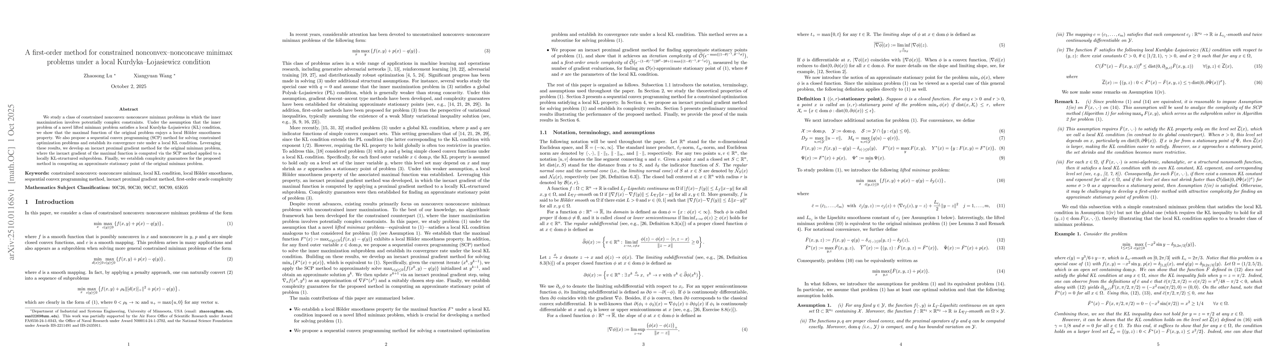 We study a class of constrained nonconvex--nonconcave minimax problems in which the inner maximization involves potentially complex constraints. Under the assumption that the inner problem of a novel lifted minimax problem satisfies a local Kurdyka-{\L}ojasiewicz (KL) condition, we show that the maximal function of the original problem enjoys a local H\"older smoothness property. We also propose a sequential convex programming (SCP) method for solving constrained optimization problems and establish its convergence rate under a local KL condition. Leveraging these results, we develop an inexact proximal gradient method for the original minimax problem, where the inexact gradient of the maximal function is computed via the SCP method applied to a locally KL-structured subproblem. Finally, we establish complexity guarantees for the proposed method in computing an approximate stationary point of the original minimax problem.