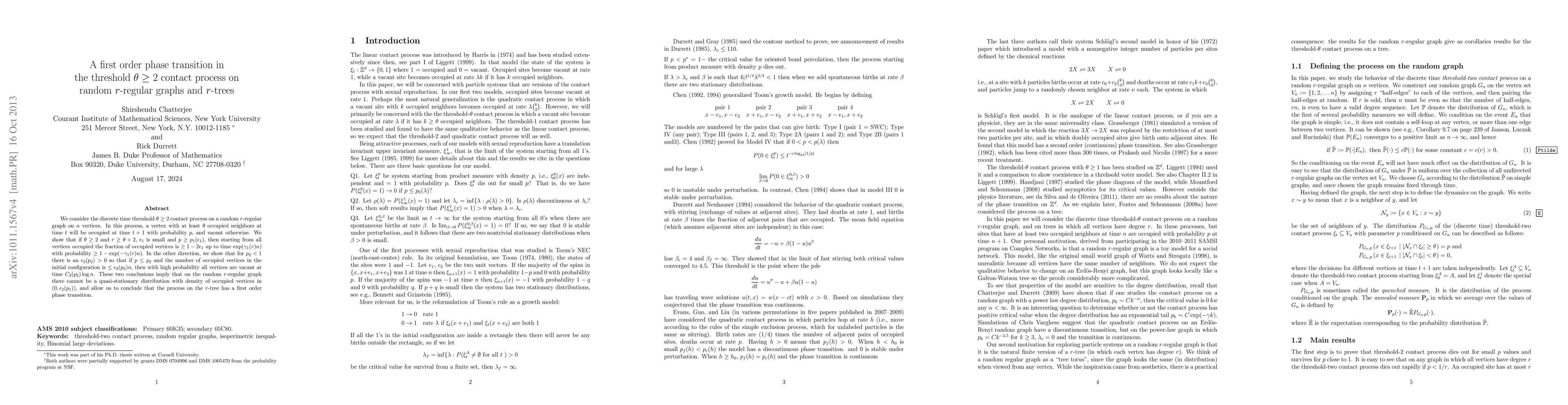 This study examines the threshold-u03b8u03bc2 contact process on random r-regular graphs and r-trees, proving a first-order phase transition. It shows that for specific conditions on r and p, the process maintains a high density of occupied vertices over time, while for lower p values, the vertices eventually become vacant. This implies no quasi-stationary distribution exists within a certain density range, confirming a phase transition in the r-tree model.