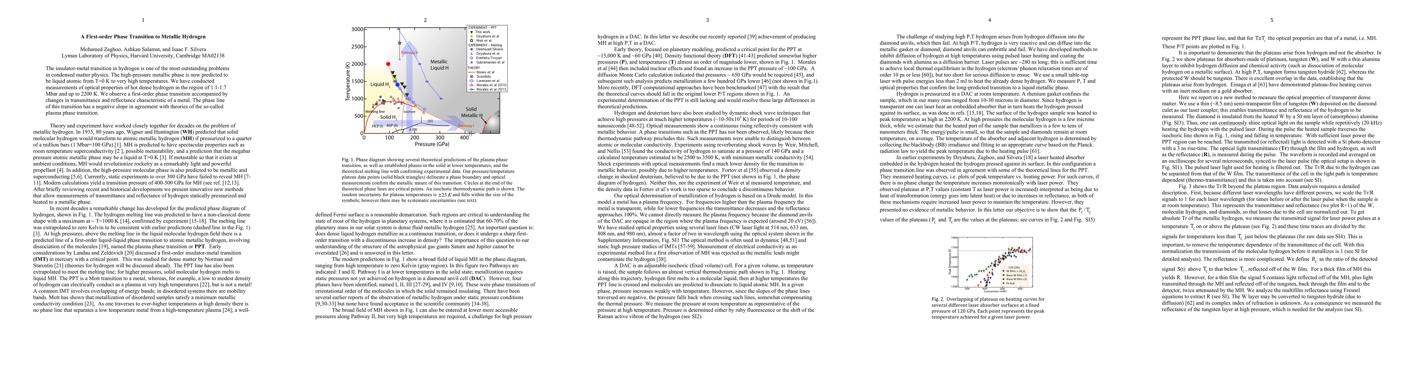 This paper reports on the first-order phase transition in hydrogen to a metallic state under high pressure and temperature, observed through changes in optical properties, confirming a negative slope in the phase line consistent with theoretical predictions of a plasma phase transition.