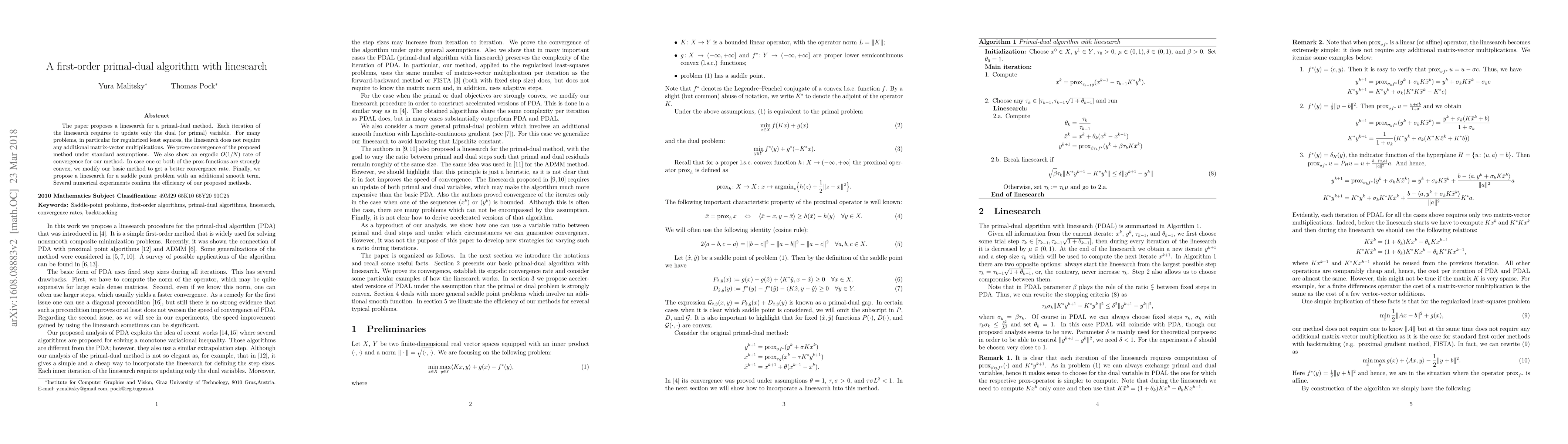The paper introduces a first-order primal-dual linesearch algorithm requiring minimal updates per iteration, achieving an $O(1/N)$ convergence rate for regularized least squares. It also adapts the method for strongly convex prox-functions and extends it to saddle point problems with smooth terms, validated by numerical experiments.