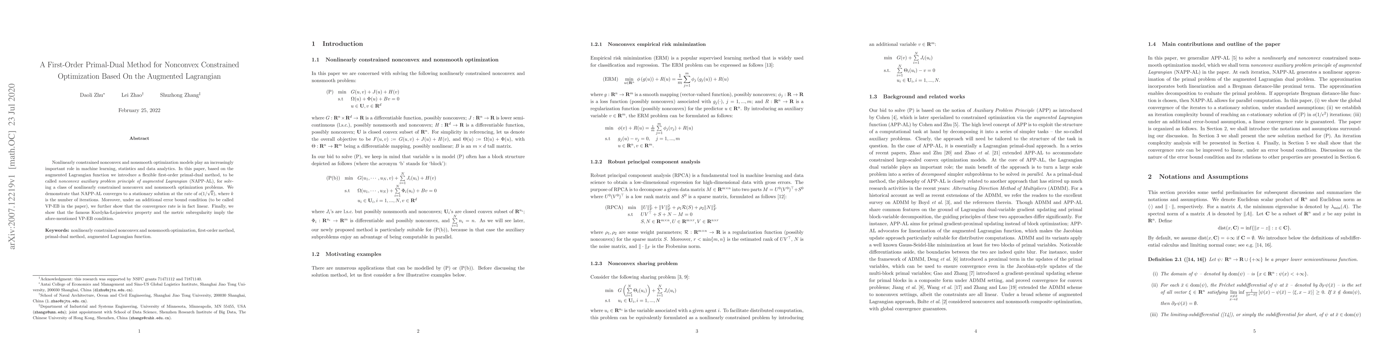 This paper introduces a first-order primal-dual method, NAPP-AL, based on the augmented Lagrangian for solving nonconvex and nonsmooth optimization problems. The method converges to a stationary solution at a rate of o(1/\sqrt{k}), and under an additional VP-EB condition, it converges linearly.