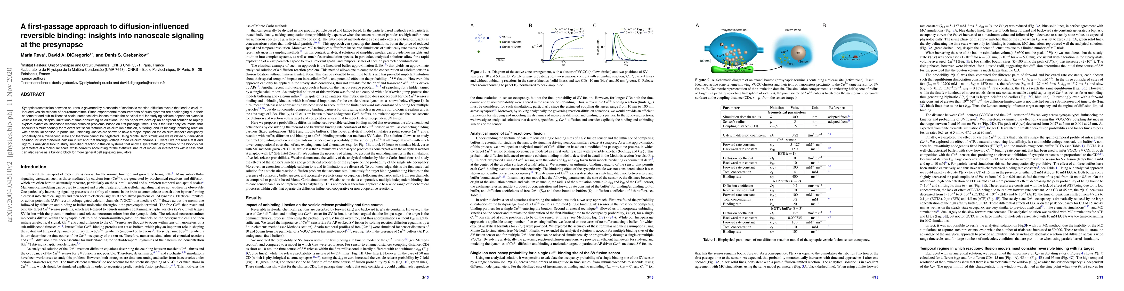 This paper presents an analytical solution for studying diffusion-influenced reversible binding in synaptic transmission, focusing on calcium-induced vesicle release. The model accounts for calcium diffusion, buffering, and binding kinetics, providing insights into nanoscale signaling at the presynapse and validated through Monte Carlo simulations.