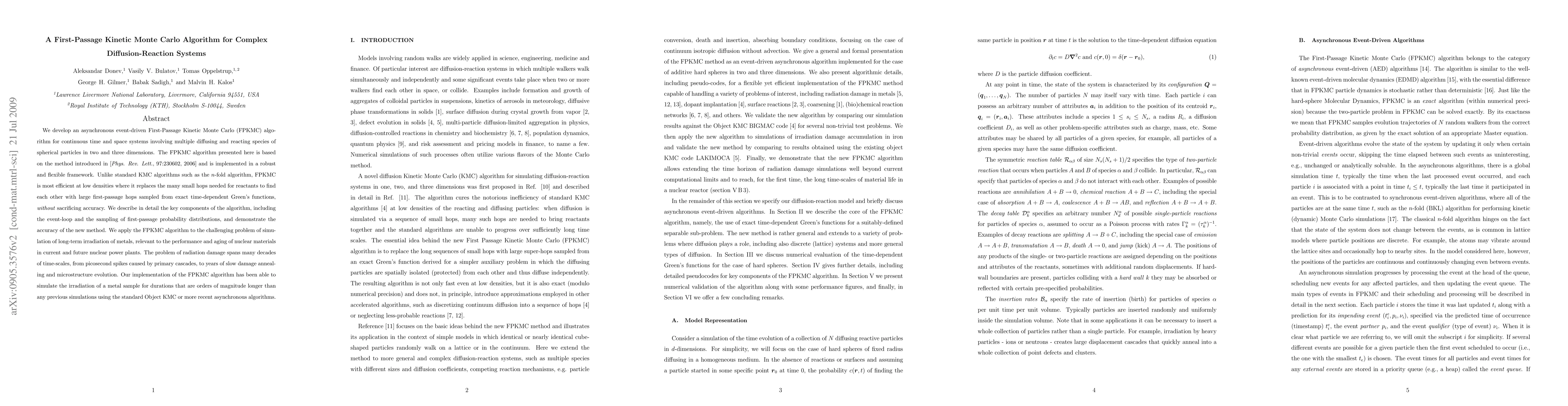 This paper introduces an efficient asynchronous First-Passage Kinetic Monte Carlo (FPKMC) algorithm for simulating complex diffusion-reaction systems, replacing small hops with large first-passage hops for improved accuracy at low densities. The method is demonstrated to simulate long-term irradiation of metals, achieving timescales orders of magnitude longer than previous methods.