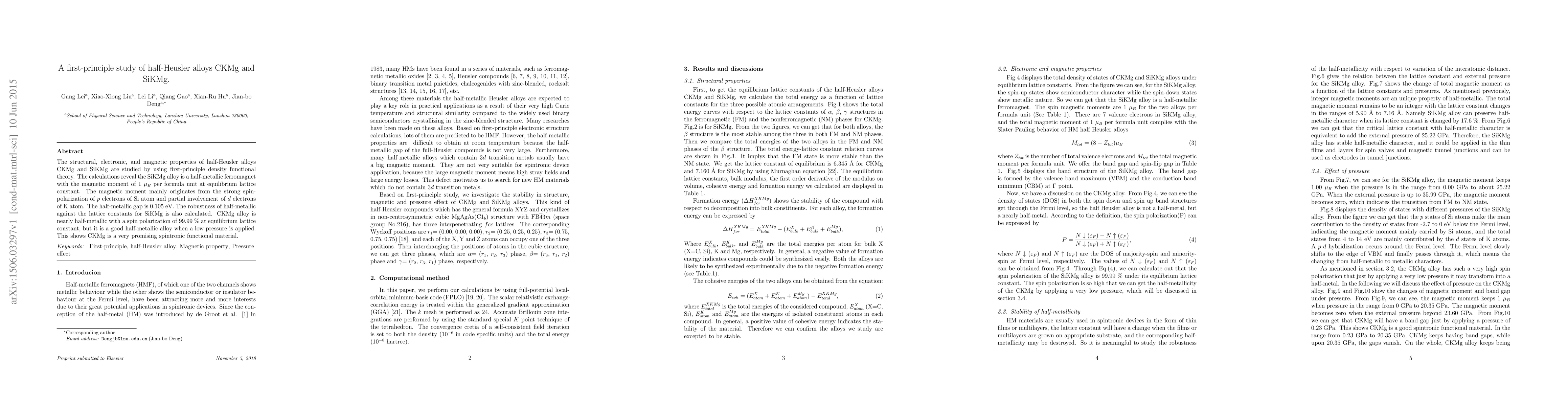 This paper uses first-principle density functional theory to analyze the structural, electronic, and magnetic properties of half-Heusler alloys CKMg and SiKMg. SiKMg is identified as a half-metallic ferromagnet with a magnetic moment of 1 $\mu_B$ per unit, while CKMg is nearly half-metallic and becomes fully half-metallic under low pressure, indicating potential for spintronic applications.
