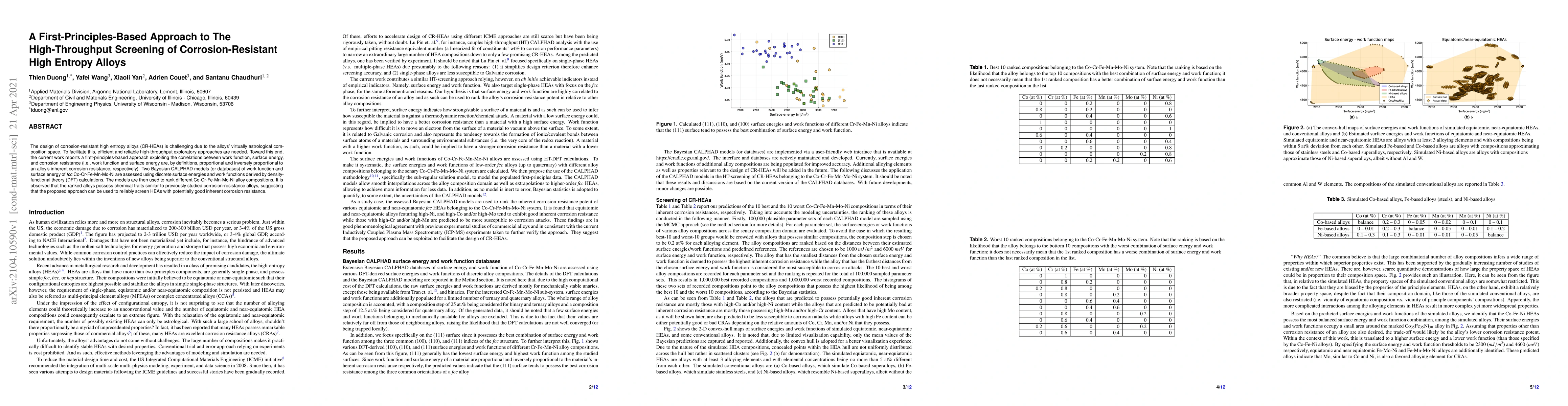 This paper proposes a first-principles-based method to screen corrosion-resistant high entropy alloys using correlations between work function, surface energy, and corrosion resistance. Bayesian CALPHAD models are employed to rank Co-Cr-Fe-Mn-Mo-Ni alloys, showing promising results aligned with known corrosion-resistant alloys.