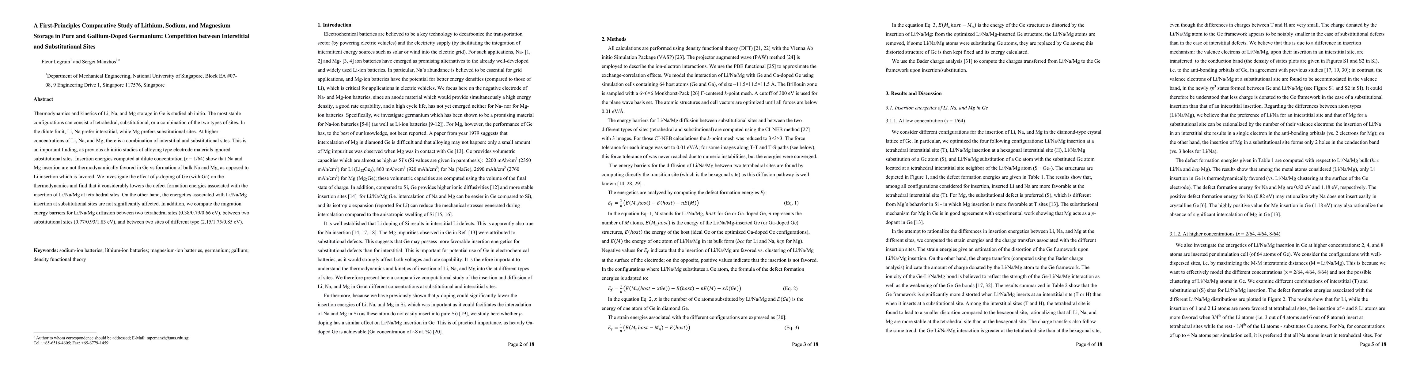This study uses first-principles calculations to compare the thermodynamics and kinetics of lithium, sodium, and magnesium storage in pure and gallium-doped germanium, revealing that Li prefers interstitial sites while Mg favors substitutional sites. Gallium doping significantly lowers the energy for interstitial insertion but has little effect on substitutional sites.