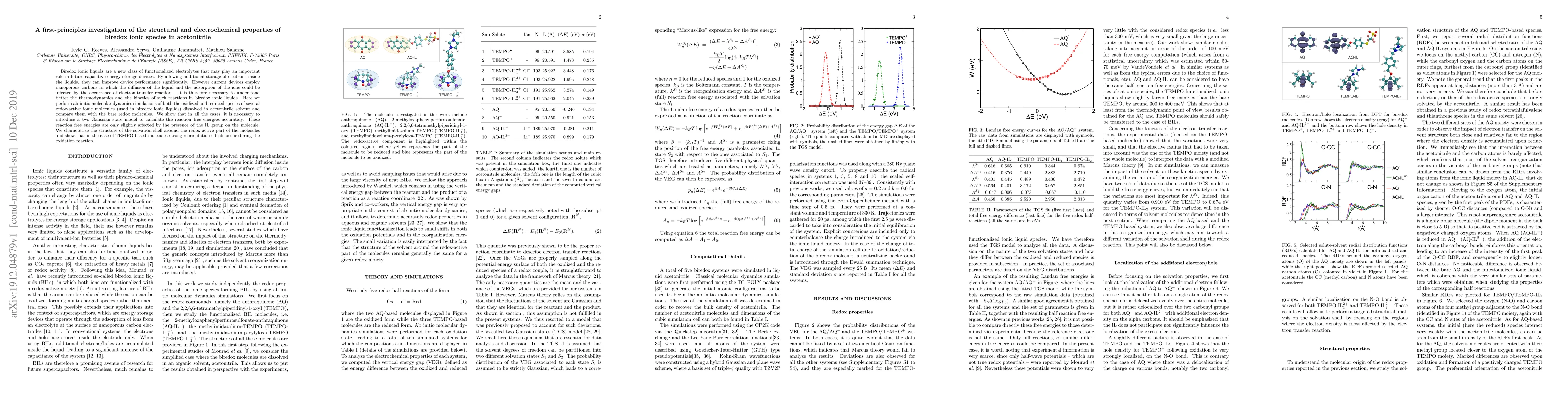 Biredox ionic liquids are a new class of functionalized electrolytes that may play an important role in future capacitive energy storage devices. By allowing additional storage of electrons inside the liquids, they can improve device performance significantly. However current devices employ nanoporous carbons in which the diffusion of the liquid and the adsorption of the ions could be affected by the occurrence of electron-transfer reactions. It is therefore necessary to understand better the thermodynamics and the kinetics of such reactions in biredox ionic liquids. Here we perform ab initio molecular dynamics simulations of both the oxidized and reduced species of several redox-active ionic molecules (used in biredox ionic liquids) dissolved in acetonitrile solvent and compare them with the bare redox molecules. We show that in all the cases, it is necessary to introduce a two Gaussian state model to calculate the reaction free energies accurately. These reaction free energies are only slightly affected by the presence of the IL group on the molecule. We characterize the structure of the solvation shell around the redox active part of the molecules and show that in the case of TEMPO-based molecules strong reorientation effects occur during the oxidation reaction.