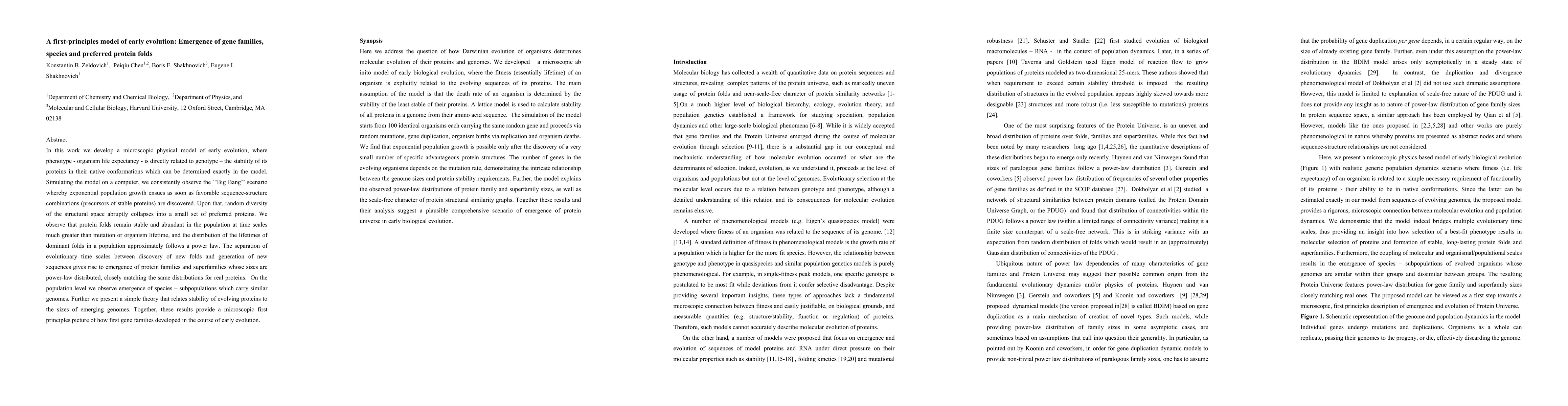 In this work we develop a microscopic physical model of early evolution, where phenotype,organism life expectancy, is directly related to genotype, the stability of its proteins in their native conformations which can be determined exactly in the model. Simulating the model on a computer, we consistently observe the Big Bang scenario whereby exponential population growth ensues as soon as favorable sequence-structure combinations (precursors of stable proteins) are discovered. Upon that, random diversity of the structural space abruptly collapses into a small set of preferred proteins. We observe that protein folds remain stable and abundant in the population at time scales much greater than mutation or organism lifetime, and the distribution of the lifetimes of dominant folds in a population approximately follows a power law. The separation of evolutionary time scales between discovery of new folds and generation of new sequences gives rise to emergence of protein families and superfamilies whose sizes are power-law distributed, closely matching the same distributions for real proteins. On the population level we observe emergence of species, subpopulations which carry similar genomes. Further we present a simple theory that relates stability of evolving proteins to the sizes of emerging genomes. Together, these results provide a microscopic first principles picture of how first gene families developed in the course of early evolution