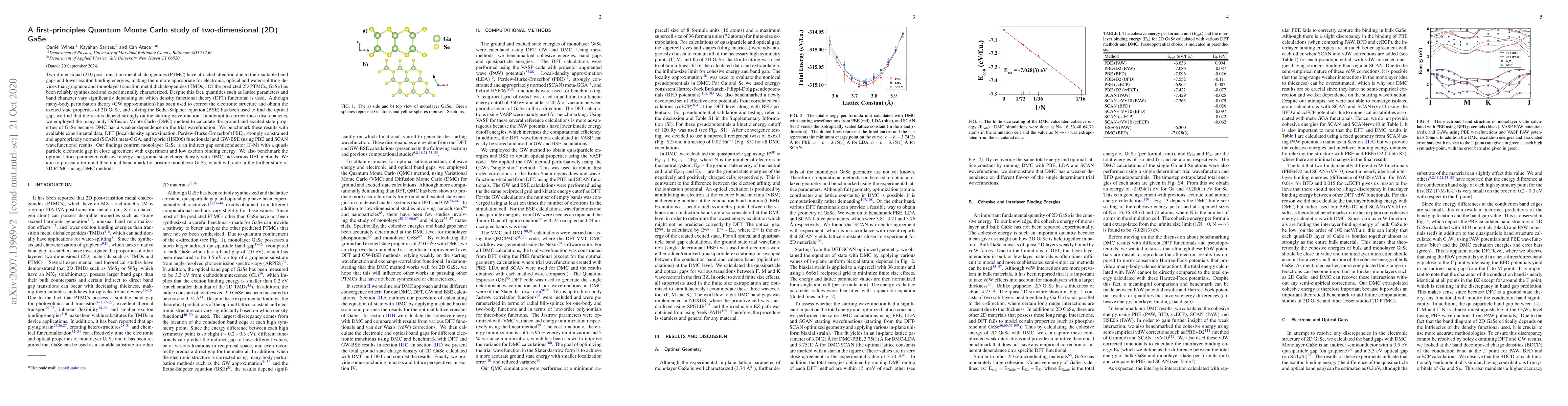 This study uses Quantum Monte Carlo's Diffusion Monte Carlo (DMC) method to accurately determine the ground and excited state properties of 2D GaSe, confirming it as an indirect gap semiconductor with low exciton binding energy, and providing a benchmark for future research on 2D post-transition metal chalcogenides.