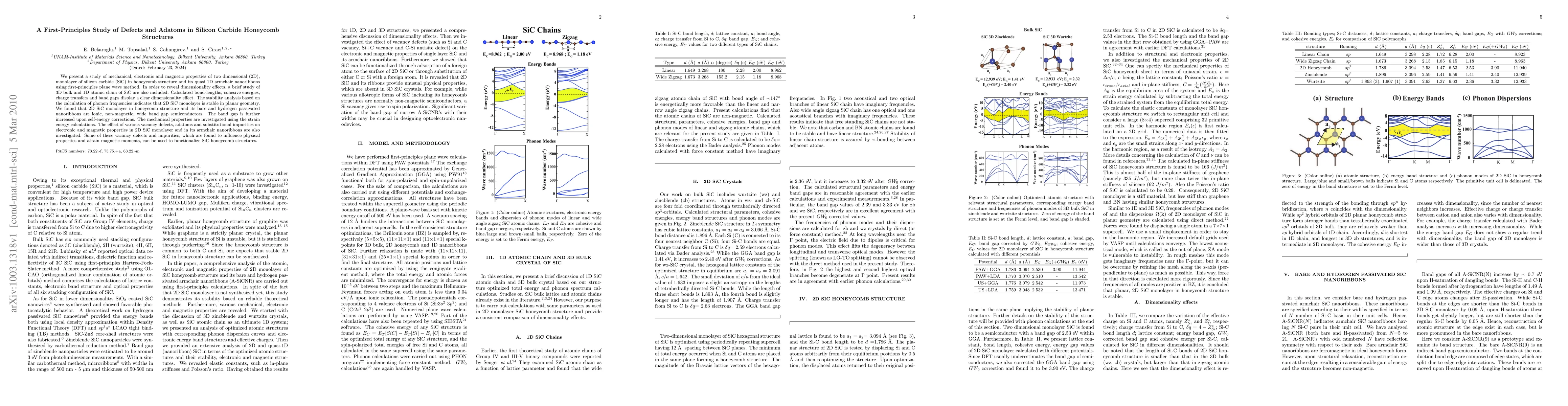 This study explores the mechanical, electronic, and magnetic properties of 2D silicon carbide (SiC) in honeycomb structures and its quasi 1D armchair nanoribbons using first-principles calculations. The analysis reveals that 2D SiC monolayers and nanoribbons are wide band gap semiconductors, with properties influenced by defects and adatoms, some of which can introduce magnetic moments.