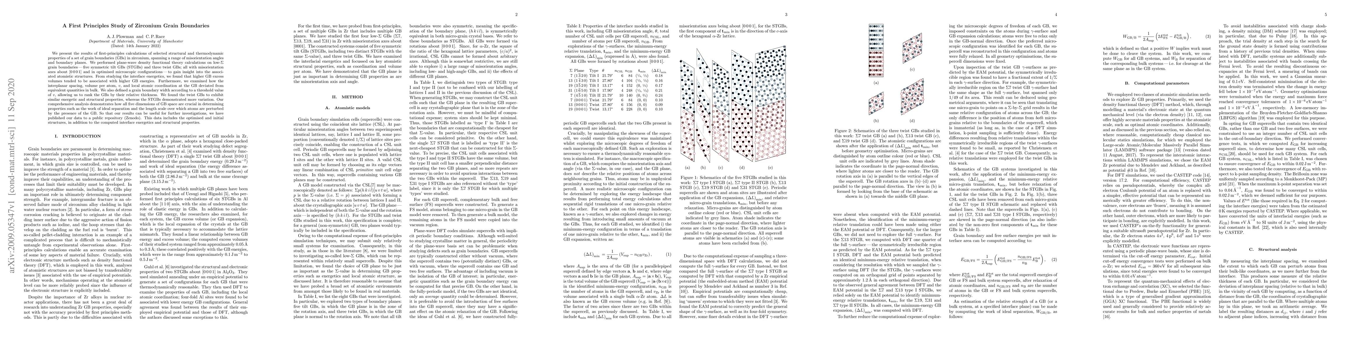 This study uses first-principles calculations to analyze the structural and thermodynamic properties of various zirconium grain boundaries, revealing that higher GB excess volumes correlate with higher GB energies. The research highlights the importance of five dimensions of GB space in determining properties like the work of ideal separation and atomic perturbation length scales.