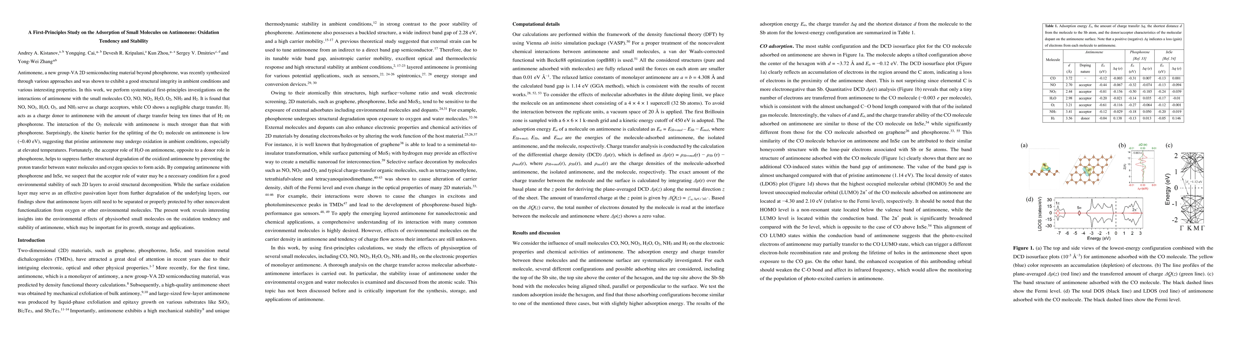 This study investigates the adsorption of small molecules on antimonene using first-principles calculations, revealing that NO, NO2, H2O, O2, and NH3 act as charge acceptors, while CO shows minimal charge transfer. H2 donates charge, and O2 has a notably strong interaction with antimonene, leading to low oxidation barriers, suggesting potential oxidation in ambient conditions, though H2O mitigates further degradation.