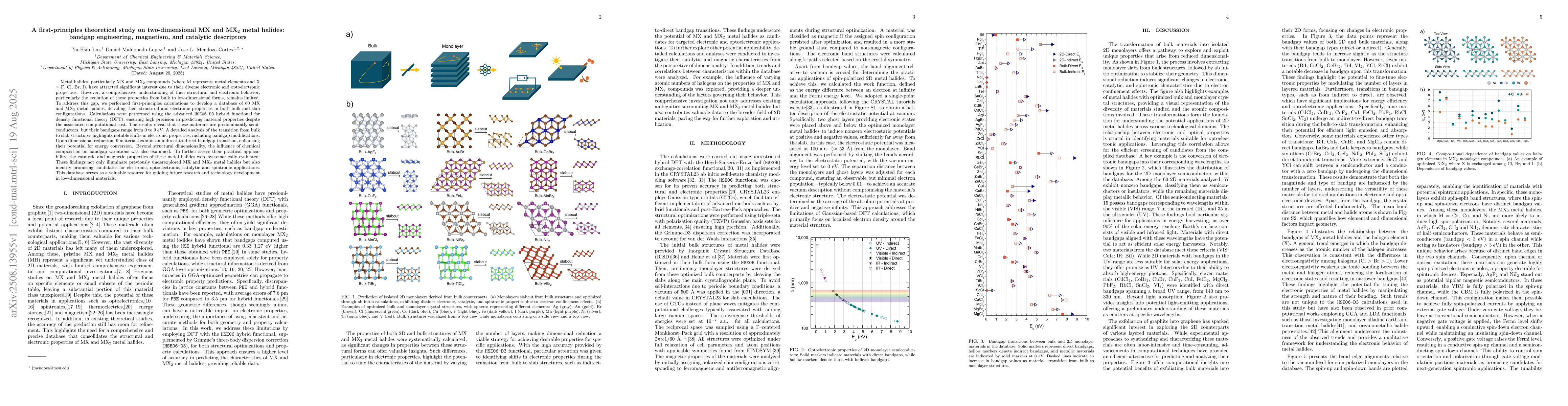 Metal halides, particularly MX and MX$_2$ compounds (where M represents metal elements and X = F, Cl, Br, I), have attracted significant interest due to their diverse electronic and optoelectronic properties. However, a comprehensive understanding of their structural and electronic behavior, particularly the evolution of these properties from bulk to low-dimensional forms, remains limited. To address this gap, we performed first-principles calculations to develop a database of 60 MX and MX$_2$ metal halides, detailing their structural and electronic properties in both bulk and slab configurations. Calculations were performed using the advanced \texttt{HSE06-D3} hybrid functional for density functional theory (DFT), ensuring high precision in predicting material properties despite the associated computational cost. The results reveal that these materials are predominantly semiconductors, but their bandgaps range from 0 to 9 eV. A detailed analysis of the transition from bulk to slab structures highlights notable shifts in electronic properties, including bandgap modifications. Upon dimensional reduction, 9 materials exhibit an indirect-to-direct bandgap transition, enhancing their potential for energy conversion. Beyond structural dimensionality, the influence of chemical composition on bandgap variations was also examined. To further assess their practical applicability, the catalytic and magnetic properties of these metal halides were systematically evaluated. These findings not only illuminate previously underexplored MX and MX$_2$ metal halides but also identify promising candidates for electronic, optoelectronic, catalytic and spintronic applications. This database serves as a valuable resource for guiding future research and technology development in low-dimensional materials.