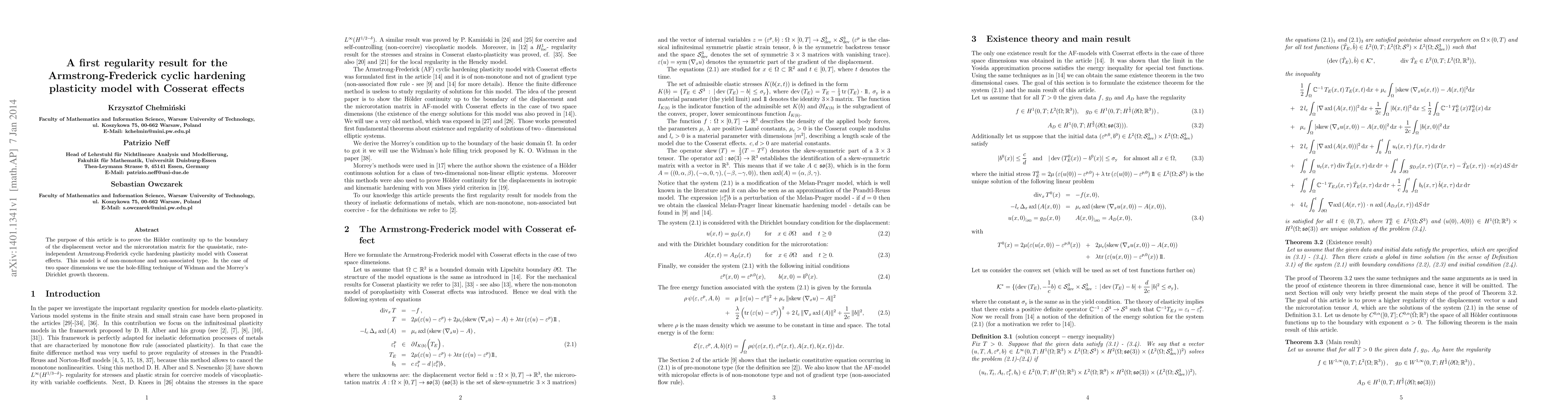 This research proves the Hölder continuity for the Armstrong-Frederick cyclic hardening plasticity model with Cosserat effects, ensuring smooth displacement and microrotation up to the boundary, using hole-filling technique and Morrey's theorem in 2D cases.