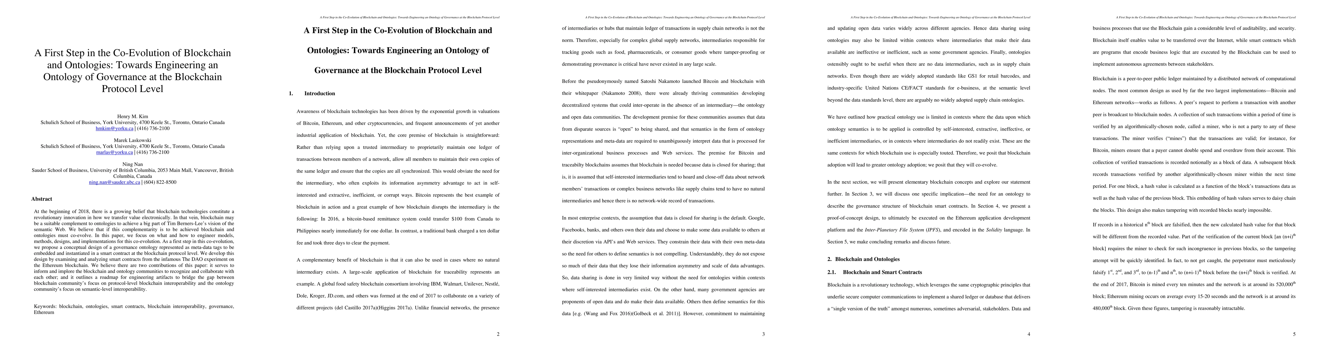 At the beginning of 2018, there is a growing belief that blockchain technologies constitute a revolutionary innovation in how we transfer value electronically. In that vein, blockchain may be a suitable complement to ontologies to achieve a big part of the vision of the semantic Web by Tim Berners-Lee. We believe that if this complementarity is to be achieved blockchain and ontologies must co-evolve. In this paper, we focus on what and how to engineer models, methods, designs, and implementations for this co-evolution. As a first step in this co-evolution, we propose a conceptual design of a governance ontology represented as meta-data tags to be embedded and instantiated in a smart contract at the blockchain protocol level. We develop this design by examining and analyzing smart contracts from the infamous The DAO experiment on the Ethereum blockchain. We believe there are two contributions of this paper: it serves to inform and implore the blockchain and ontology communities to recognize and collaborate with each other; and it outlines a roadmap for engineering artifacts to bridge the gap between blockchain community focus on protocol-level blockchain interoperability and the ontology community focus on semantic-level interoperability.