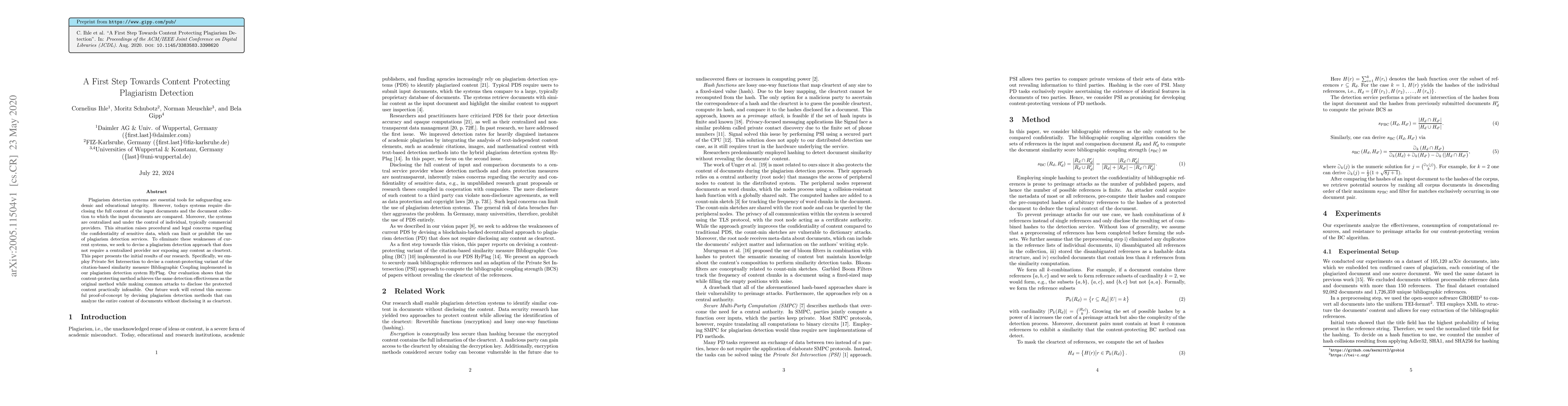 Plagiarism detection systems are essential tools for safeguarding academic and educational integrity. However, today's systems require disclosing the full content of the input documents and the document collection to which the input documents are compared. Moreover, the systems are centralized and under the control of individual, typically commercial providers. This situation raises procedural and legal concerns regarding the confidentiality of sensitive data, which can limit or prohibit the use of plagiarism detection services. To eliminate these weaknesses of current systems, we seek to devise a plagiarism detection approach that does not require a centralized provider nor exposing any content as cleartext. This paper presents the initial results of our research. Specifically, we employ Private Set Intersection to devise a content-protecting variant of the citation-based similarity measure Bibliographic Coupling implemented in our plagiarism detection system HyPlag. Our evaluation shows that the content-protecting method achieves the same detection effectiveness as the original method while making common attacks to disclose the protected content practically infeasible. Our future work will extend this successful proof-of-concept by devising plagiarism detection methods that can analyze the entire content of documents without disclosing it as cleartext.