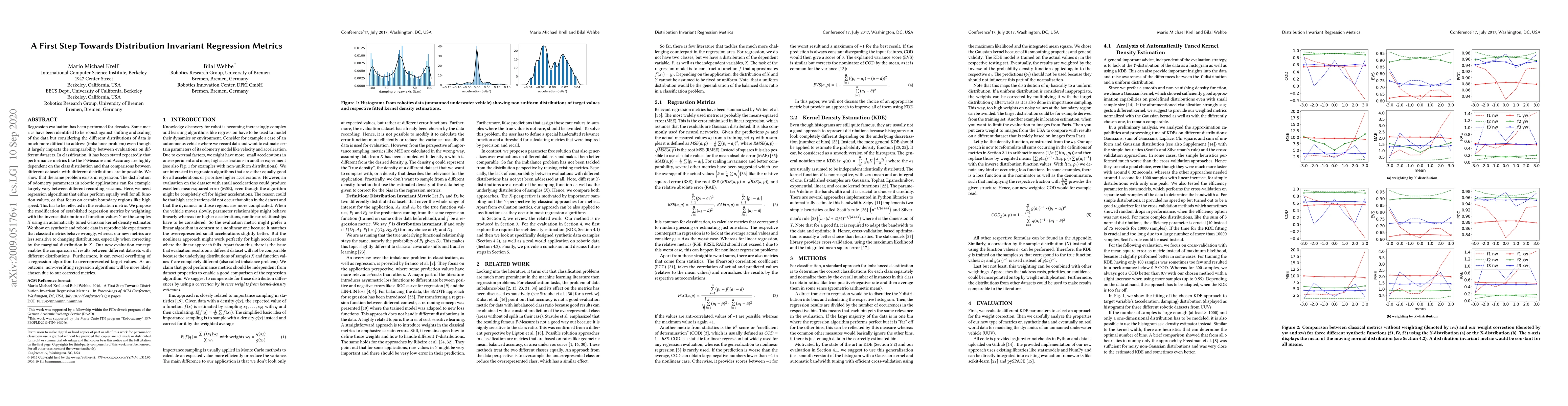 Regression evaluation has been performed for decades. Some metrics have been identified to be robust against shifting and scaling of the data but considering the different distributions of data is much more difficult to address (imbalance problem) even though it largely impacts the comparability between evaluations on different datasets. In classification, it has been stated repeatedly that performance metrics like the F-Measure and Accuracy are highly dependent on the class distribution and that comparisons between different datasets with different distributions are impossible. We show that the same problem exists in regression. The distribution of odometry parameters in robotic applications can for example largely vary between different recording sessions. Here, we need regression algorithms that either perform equally well for all function values, or that focus on certain boundary regions like high speed. This has to be reflected in the evaluation metric. We propose the modification of established regression metrics by weighting with the inverse distribution of function values $Y$ or the samples $X$ using an automatically tuned Gaussian kernel density estimator. We show on synthetic and robotic data in reproducible experiments that classical metrics behave wrongly, whereas our new metrics are less sensitive to changing distributions, especially when correcting by the marginal distribution in $X$. Our new evaluation concept enables the comparison of results between different datasets with different distributions. Furthermore, it can reveal overfitting of a regression algorithm to overrepresented target values. As an outcome, non-overfitting regression algorithms will be more likely chosen due to our corrected metrics.