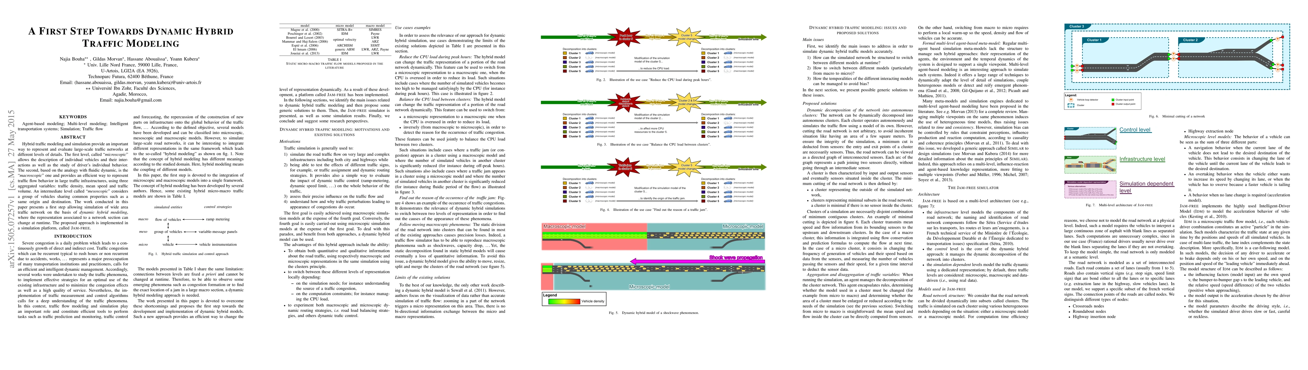 Hybrid traffic modeling and simulation provide an important way to represent and evaluate large-scale traffic networks at different levels of details. The first level, called "microscopic" allows the description of individual vehicles and their interactions as well as the study of driver's individual behavior. The second, based on the analogy with fluidic dynamic, is the "macroscopic" one and provides an efficient way to represent traffic flow behavior in large traffic infrastructures, using three aggregated variables: traffic density, mean speed and traffic volume. An intermediate level called "mesoscopic" considers a group of vehicles sharing common properties such as a same origin and destination. The work conducted in this paper presents a first step allowing simulation of wide area traffic network on the basis of dynamic hybrid modeling, where the representation associated to a network section can change at runtime. The proposed approach is implemented in a simulation platform, called Jam-free.
