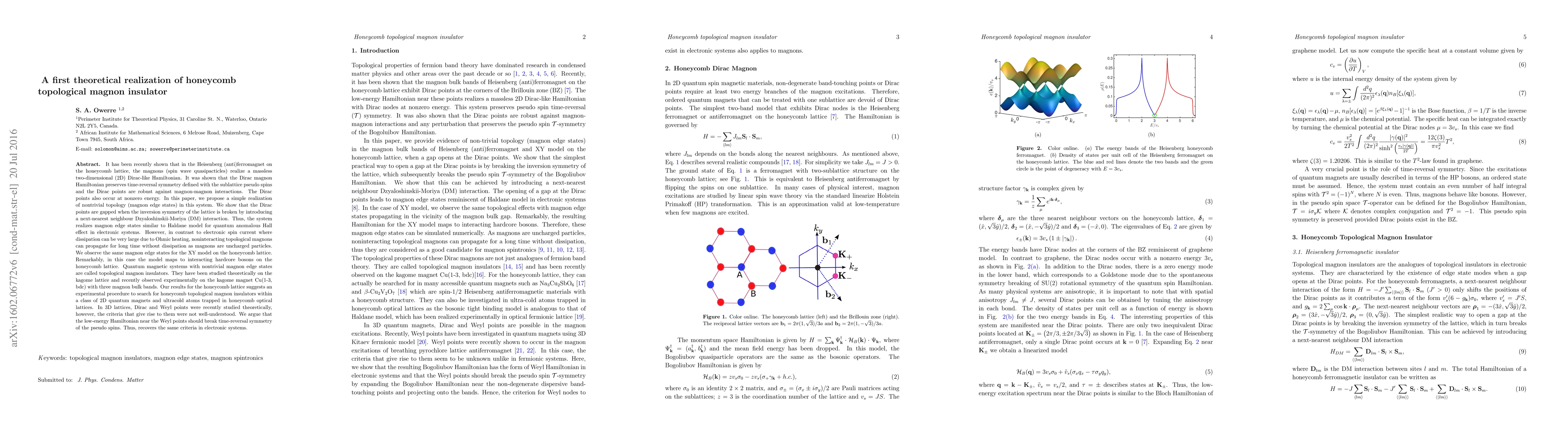 This paper proposes a theoretical realization of a topological magnon insulator on a honeycomb lattice by introducing a Dzyaloshinskii-Moriya interaction to break inversion symmetry, creating magnon edge states akin to the quantum anomalous Hall effect in electronic systems. Unlike electronic spin currents, topological magnons can propagate long distances without dissipation.