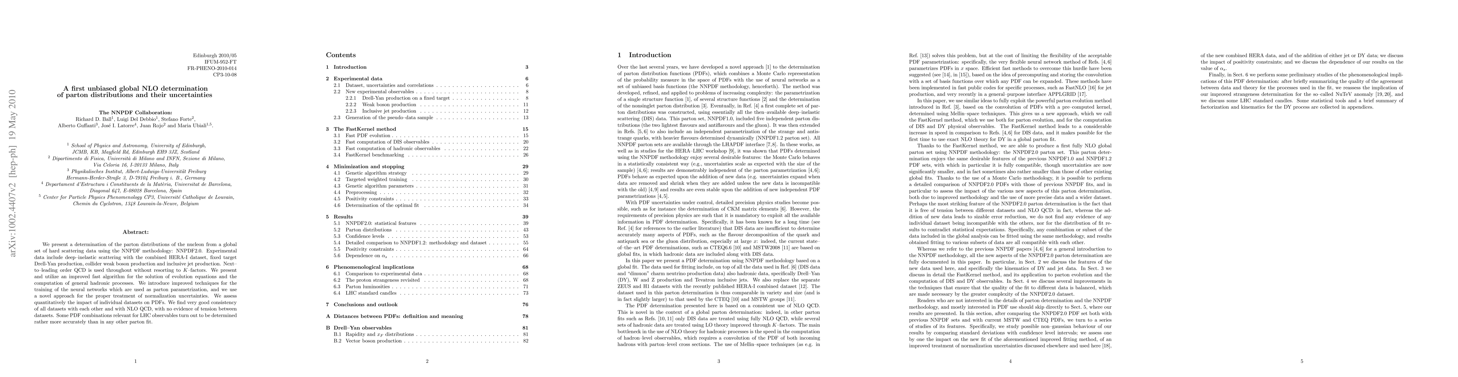 This paper presents a new global determination of parton distributions using the NNPDF2.0 methodology, incorporating diverse hard scattering data and employing next-to-leading order QCD without K-factors. The study highlights improved algorithms and techniques for neural network training and uncertainty treatment, showing good consistency across datasets and enhanced accuracy for certain LHC observables.