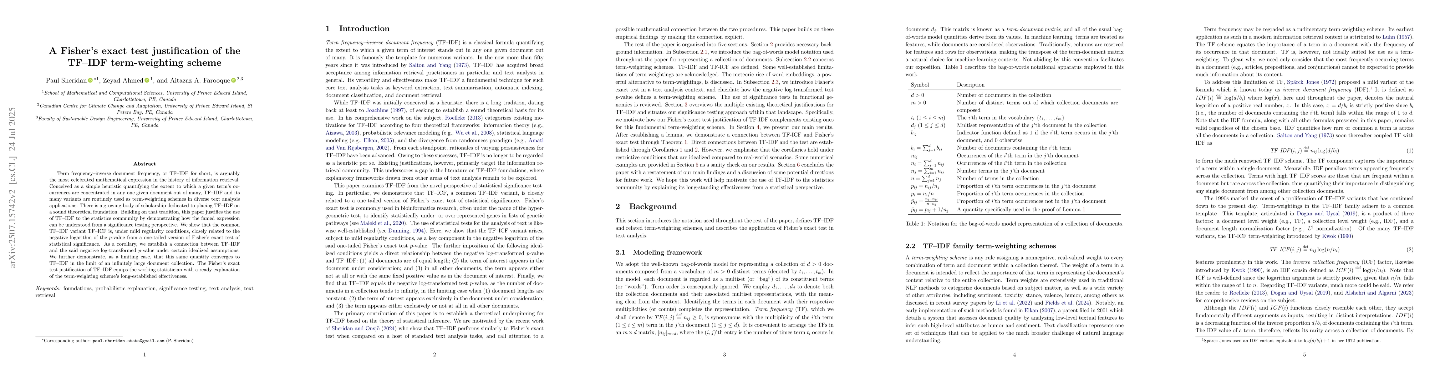 Term frequency-inverse document frequency, or TF-IDF for short, is arguably the most celebrated mathematical expression in the history of information retrieval. Conceived as a simple heuristic quantifying the extent to which a given term's occurrences are concentrated in any one given document out of many, TF-IDF and its many variants are routinely used as term-weighting schemes in diverse text analysis applications. There is a growing body of scholarship dedicated to placing TF-IDF on a sound theoretical foundation. Building on that tradition, this paper justifies the use of TF-IDF to the statistics community by demonstrating how the famed expression can be understood from a significance testing perspective. We show that the common TF-IDF variant TF-ICF is, under mild regularity conditions, closely related to the negative logarithm of the $p$-value from a one-tailed version of Fisher's exact test of statistical significance. As a corollary, we establish a connection between TF-IDF and the said negative log-transformed $p$-value under certain idealized assumptions. We further demonstrate, as a limiting case, that this same quantity converges to TF-IDF in the limit of an infinitely large document collection. The Fisher's exact test justification of TF-IDF equips the working statistician with a ready explanation of the term-weighting scheme's long-established effectiveness.