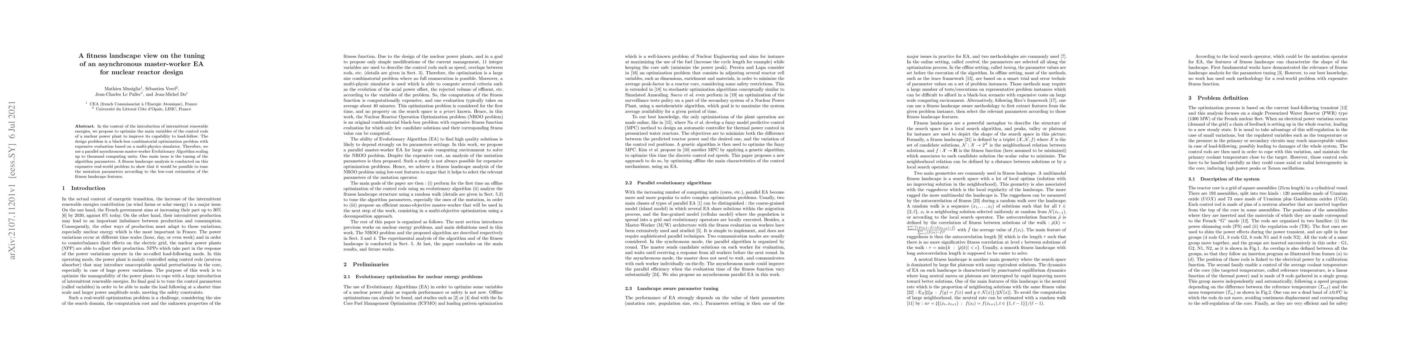 In the context of the introduction of intermittent renewable energies, we propose to optimize the main variables of the control rods of a nuclear power plant to improve its capability to load-follow. The design problem is a black-box combinatorial optimization problem with expensive evaluation based on a multi-physics simulator. Therefore, we use a parallel asynchronous master-worker Evolutionary Algorithm scaling up to thousand computing units. One main issue is the tuning of the algorithm parameters. A fitness landscape analysis is conducted on this expensive real-world problem to show that it would be possible to tune the mutation parameters according to the low-cost estimation of the fitness landscape features.
