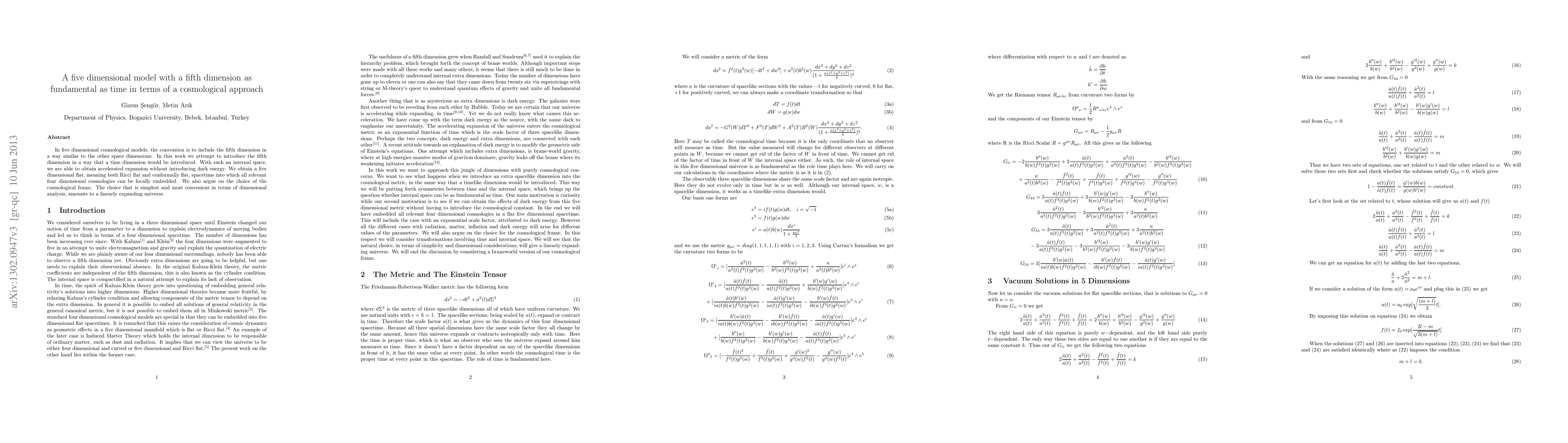 In five dimensional cosmological models, the convention is to include the fifth dimension in a way similar to the other space dimensions. In this work we attempt to introduce the fifth dimension in a way that a time dimension would be introduced. With such an internal space, we are able to obtain accelerated expansion without introducing dark energy. We obtain a five dimensional flat, meaning both Ricci flat and conformally flat, spacetime into which all relevant four dimensional cosmologies can be locally embedded. We also argue on the choice of the cosmological frame. The choice that is simplest and most convenient in terms of dimensional analysis, amounts to a linearly expanding universe.