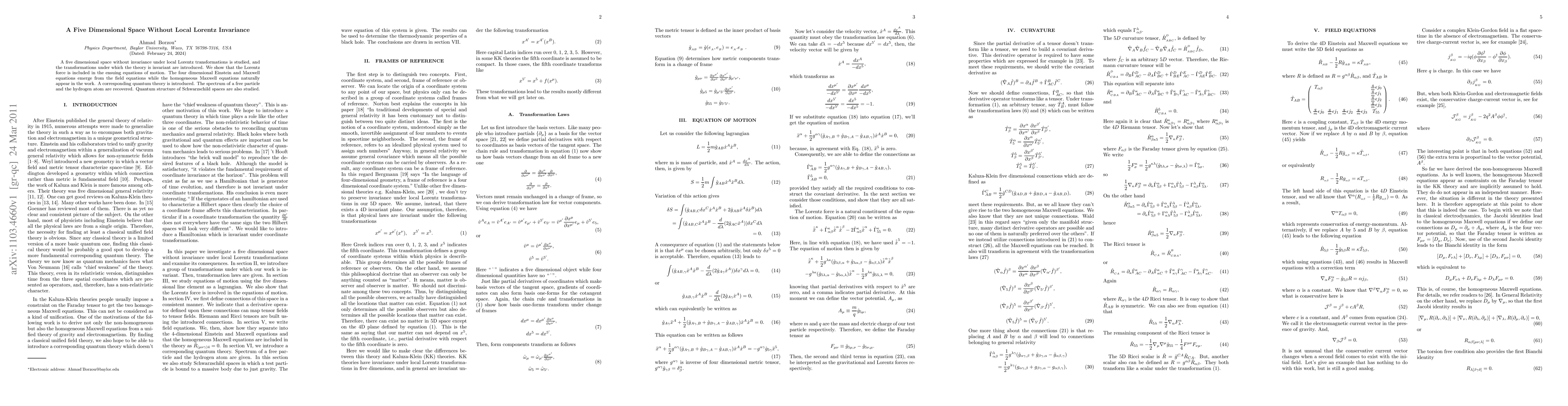 A five dimensional space without invariance under local Lorentz transformations is studied, and the transformations under which the theory is invariant are introduced. We show that the Lorentz force is included in the ensuing equations of motion. The four dimensional Einstein and Maxwell equations emerge from the field equations while the homogeneous Maxwell equations naturally appear in the work. A corresponding quantum theory is introduced. The spectrum of a free particle and the hydrogen atom are recovered. Quantum structure of Schwarzschild spaces are also studied.