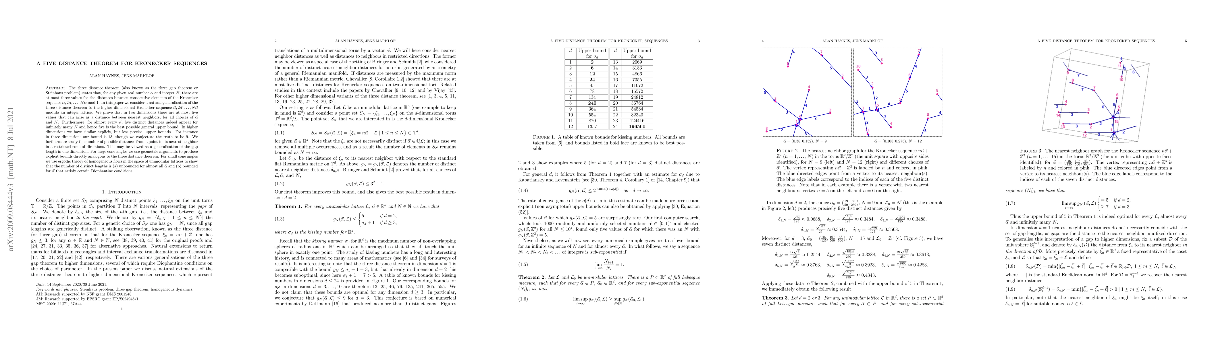 This paper extends the three distance theorem to higher dimensions, proving that in two dimensions, there are at most five distinct distances between nearest neighbors in a Kronecker sequence, which is the best possible bound for most alpha values. In higher dimensions, the bounds are less precise but still explicit, with 13 in three dimensions being the current upper bound. The research also explores the number of possible distances from a point to its nearest neighbor in a restricted cone of directions, with findings varying based on cone angle size and Diophantine conditions of alpha.