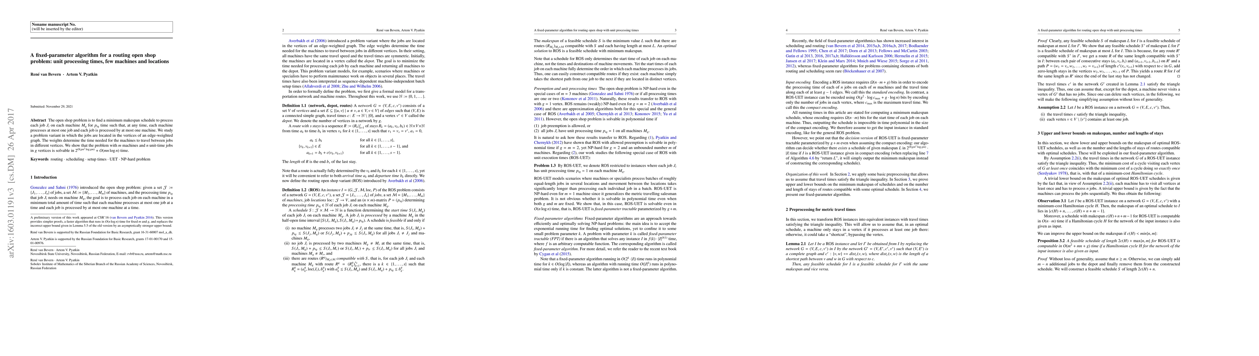 The open shop problem is to find a minimum makespan schedule to process each job $J_i$ on each machine $M_q$ for $p_{iq}$ time such that, at any time, each machine processes at most one job and each job is processed by at most one machine. We study a problem variant in which the jobs are located in the vertices of an edge-weighted graph. The weights determine the time needed for the machines to travel between jobs in different vertices. We show that the problem with $m$ machines and $n$ unit-time jobs in $g$ vertices is solvable in $2^{O(gm^2\log gm)}+O(mn\log n)$ time.