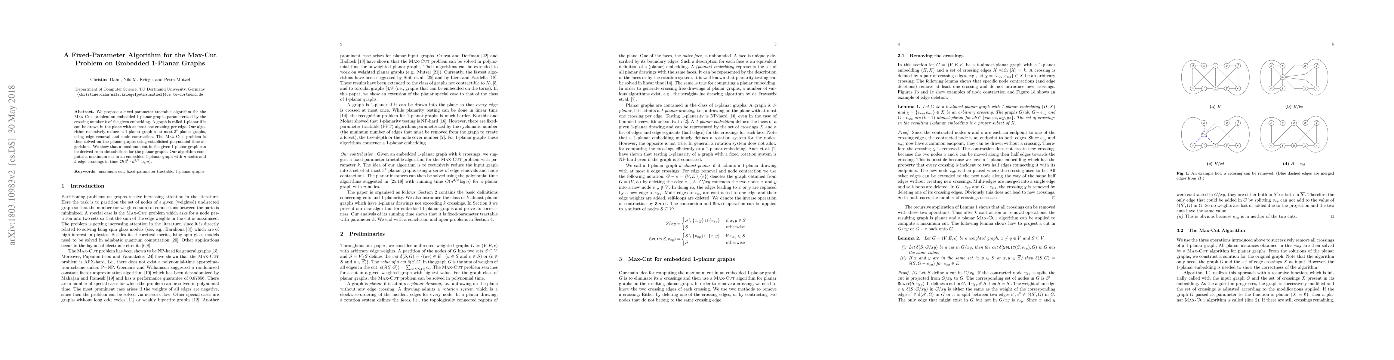 This paper presents a fixed-parameter tractable algorithm for solving the Max-Cut problem on embedded 1-planar graphs, parameterized by their crossing number $k$. The algorithm reduces the 1-planar graph into at most $3^k$ planar graphs, solving the Max-Cut problem on each using polynomial-time methods and deriving the solution for the original graph. The overall runtime is $\mathcal{O}(3^k \cdot n^{3/2} \log n)$.