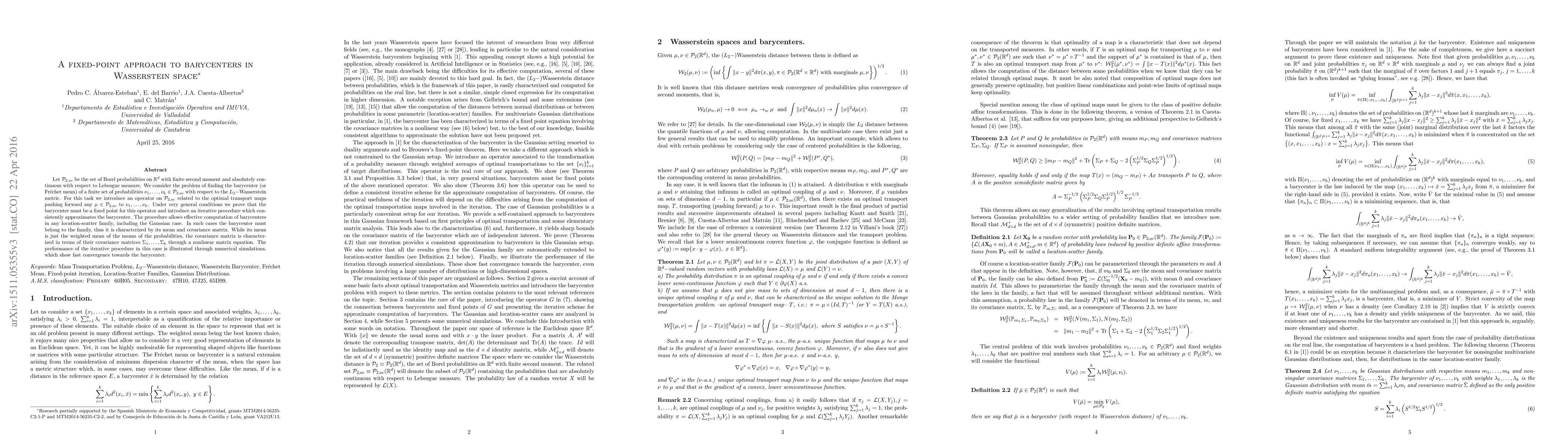 Researchers developed an iterative procedure to find barycenters in a specific space, which converges quickly to the desired point. They also showed that the resulting point can be characterized by its mean and covariance matrix, making it useful for various location-scatter families.