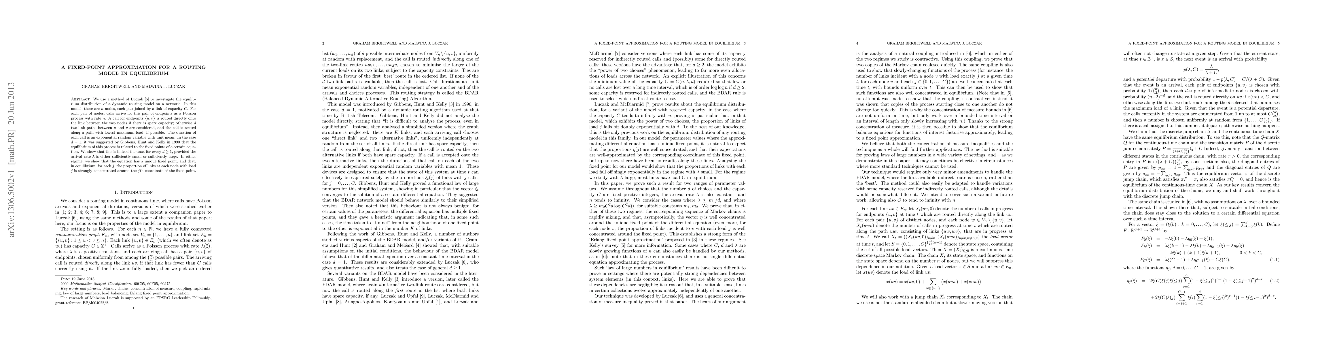 We use a method of Luczak (arXiv:1212.3231) to investigate the equilibrium distribution of a dynamic routing model on a network. In this model, there are $n$ nodes, each pair joined by a link of capacity $C$. For each pair of nodes, calls arrive for this pair of endpoints as a Poisson process with rate $\lambda$. A call for endpoints $\{u,v\}$ is routed directly onto the link between the two nodes if there is spare capacity; otherwise $d$ two-link paths between $u$ and $v$ are considered, and the call is routed along a path with lowest maximum load, if possible. The duration of each call is an exponential random variable with unit mean. In the case $d=1$, it was suggested by Gibbens, Hunt and Kelly in 1990 that the equilibrium of this process is related to the fixed points of a certain equation. We show that this is indeed the case, for every $d \ge 1$, provided the arrival rate $\lambda$ is either sufficiently small or sufficiently large. In either regime, we show that the equation has a unique fixed point, and that, in equilibrium, for each $j$, the proportion of links at each node with load $j$ is strongly concentrated around the $j$th coordinate of the fixed point.