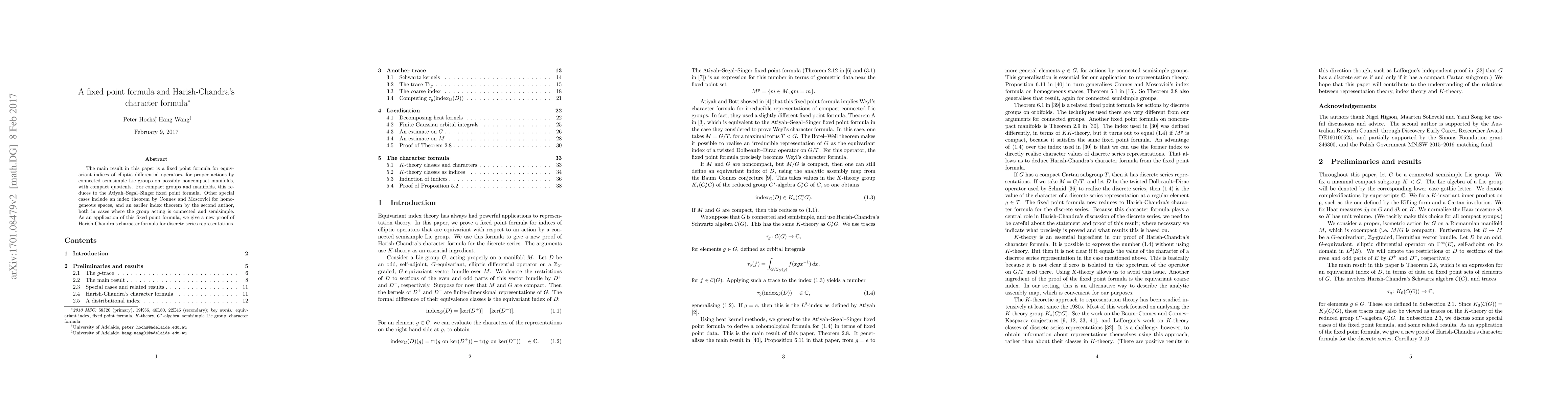 This paper presents a fixed point formula for equivariant indices of elliptic differential operators under proper actions by connected semisimple Lie groups, extending the Atiyah-Segal-Singer fixed point formula. It also provides a new proof of Harish-Chandra's character formula for discrete series representations using the developed fixed point formula.
