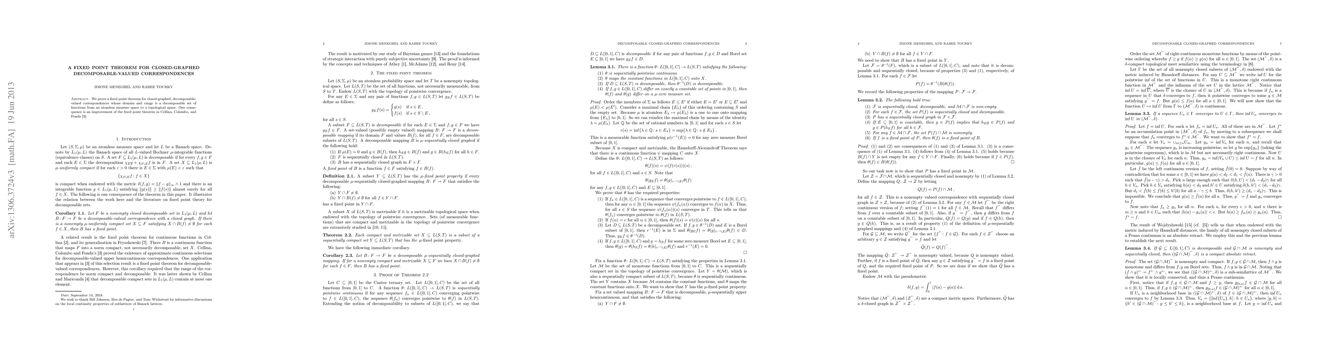 Summary: This paper establishes a fixed point theorem for closed-graphed, decomposable-valued correspondences defined on decomposable sets of functions. It improves upon a previous fixed point theorem by Cellina, Colombo, and Fonda (1986).