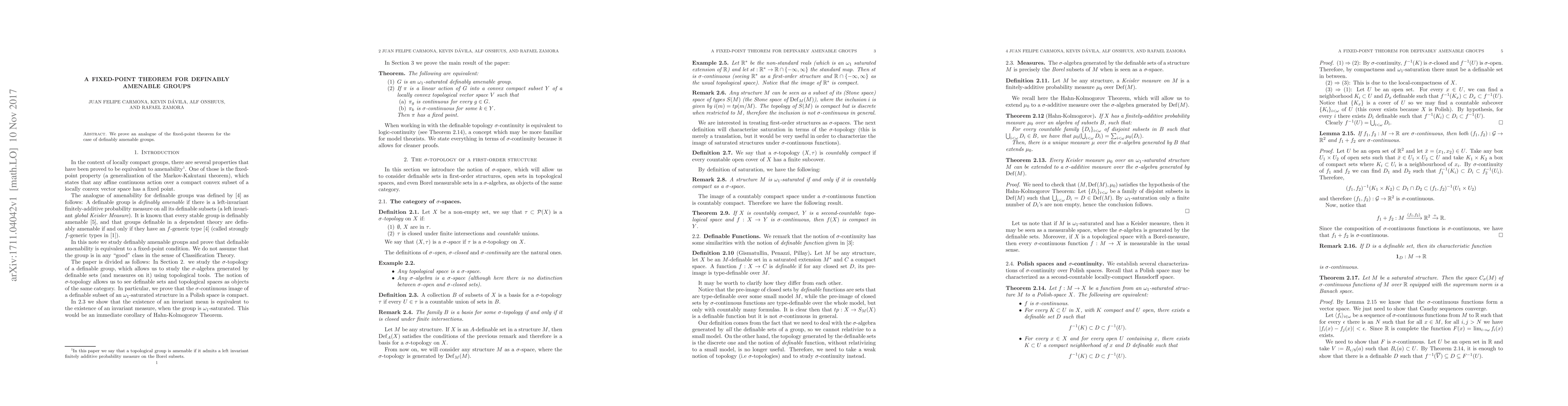Summary: This paper establishes an analogue of the fixed-point theorem for definably amenable groups, extending the classical result to a more abstract mathematical setting. The proof leverages advanced techniques from model theory and group theory.