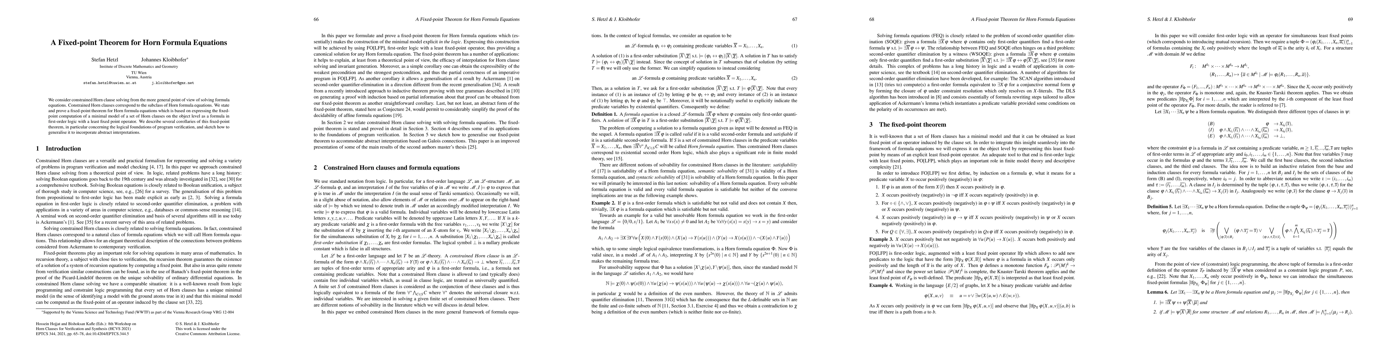This paper presents a fixed-point theorem for Horn formula equations, establishing a method to compute minimal models of Horn clauses using first-order logic with a least fixed point operator. It also explores implications for program verification and outlines potential generalizations to abstract interpretations.